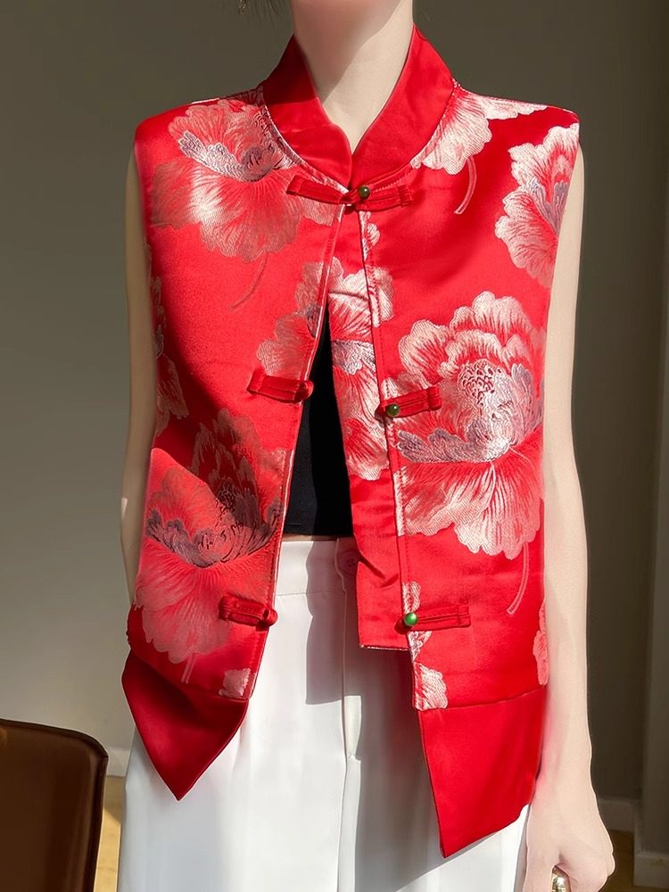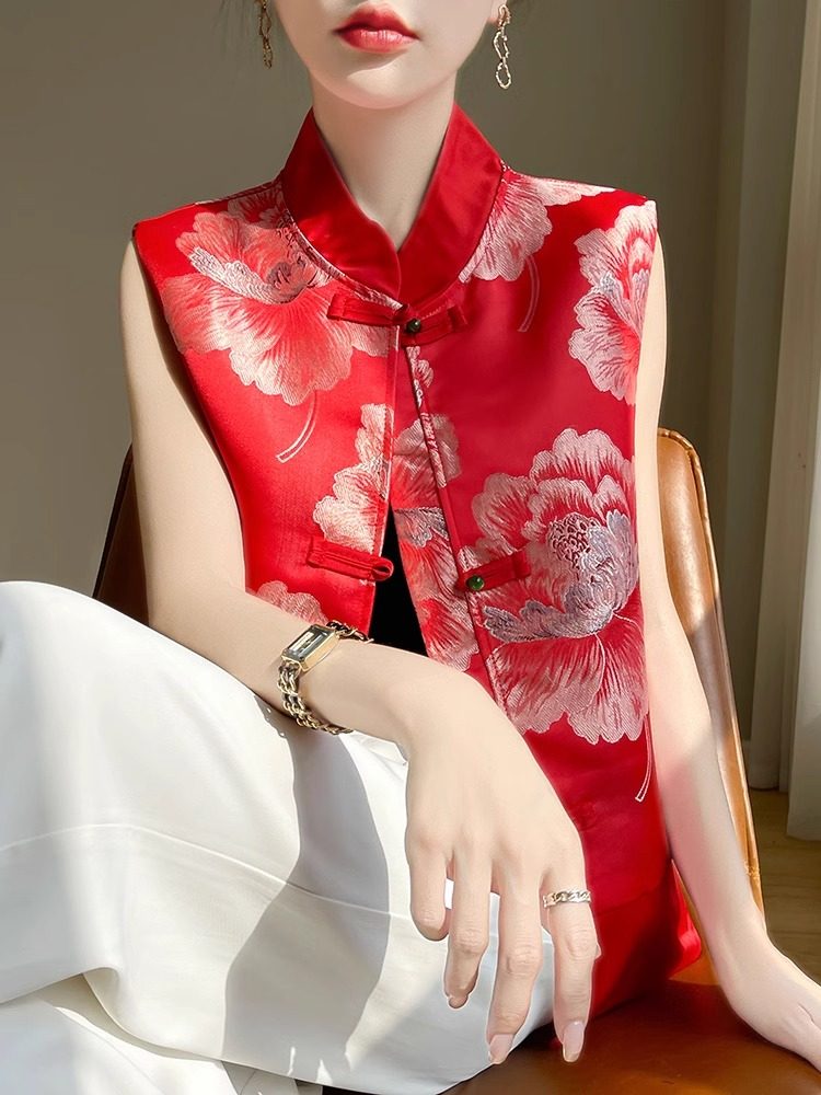 新中式国风盘扣缎面刺绣马甲女2025新款背心立领无袖提花上衣坎肩