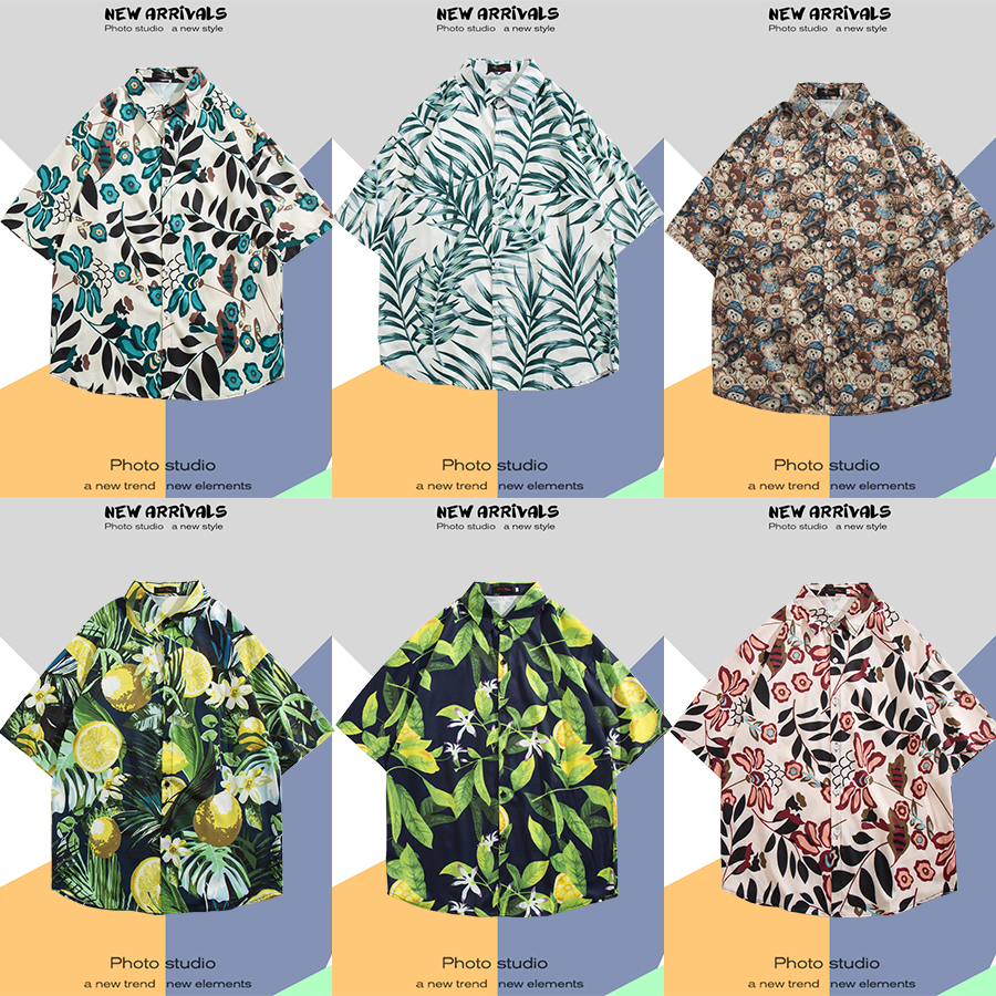 夏季港风日系短袖衬衫男韩版潮流宽松夏威夷复古痞帅海边花衬衣潮