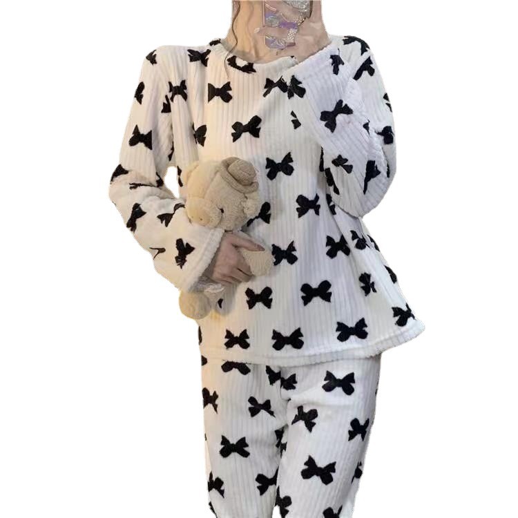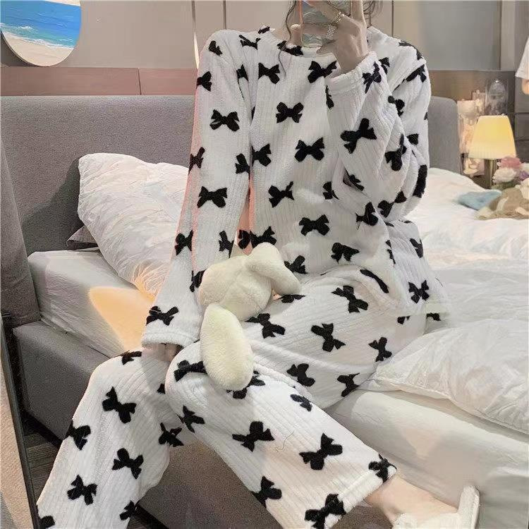蝴蝶结睡衣珊瑚绒家居服2025秋冬季新款女士外穿宽松加厚懒人