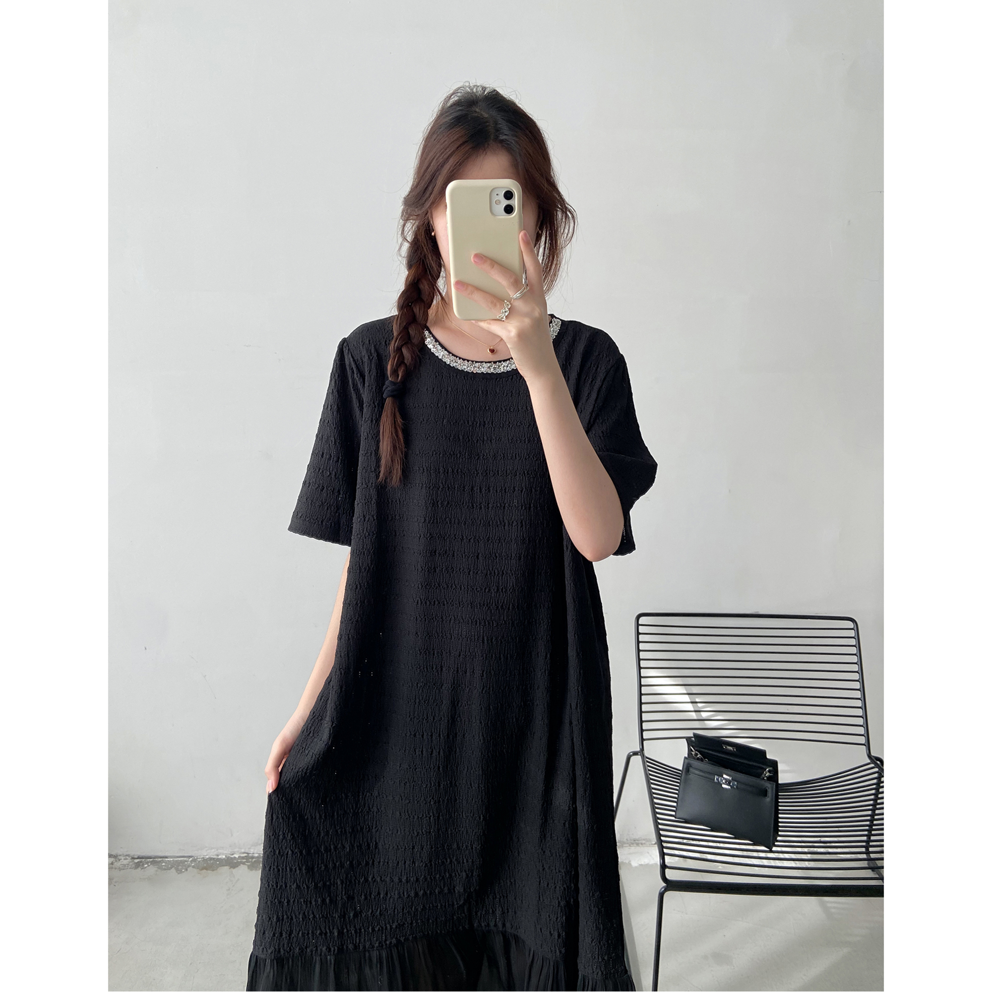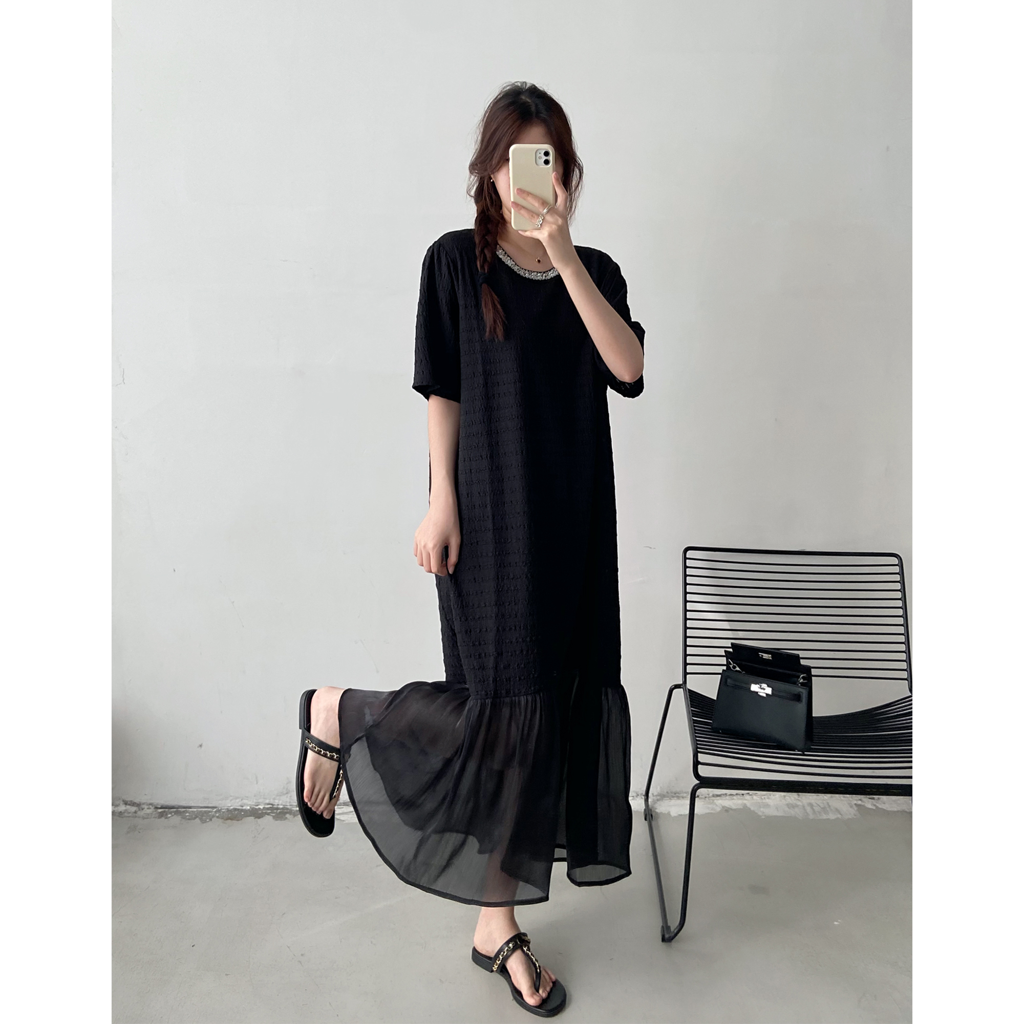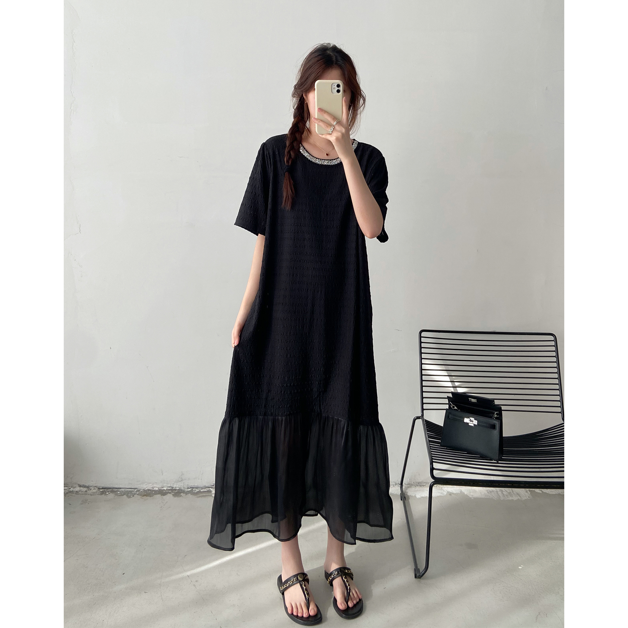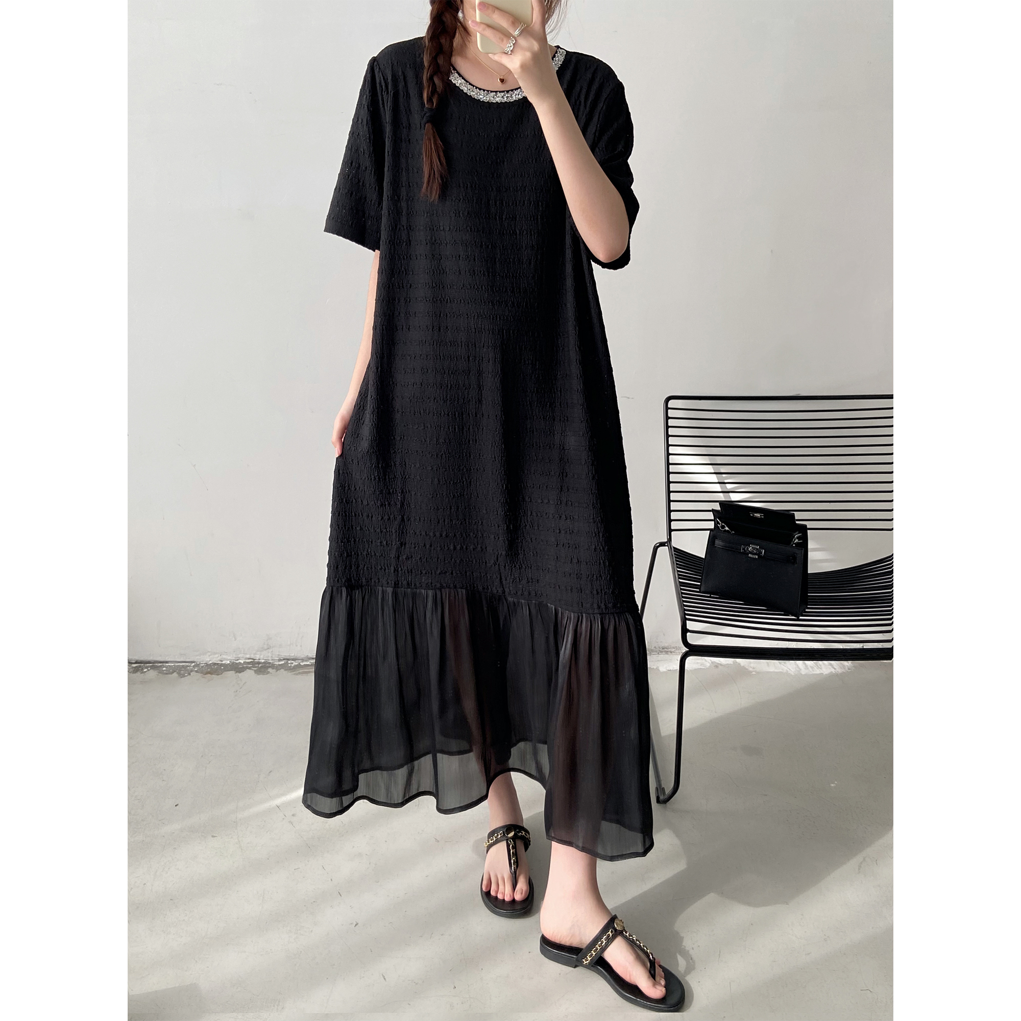 新款宽松显瘦休闲拼接网纱长裙子2025黑色设计感T恤连衣裙女夏季