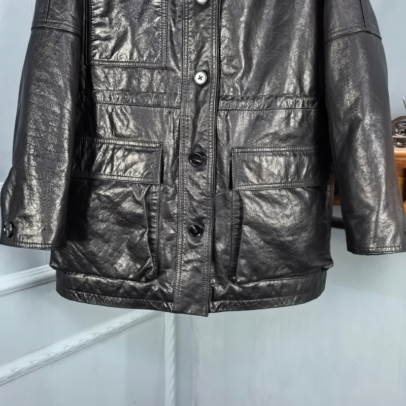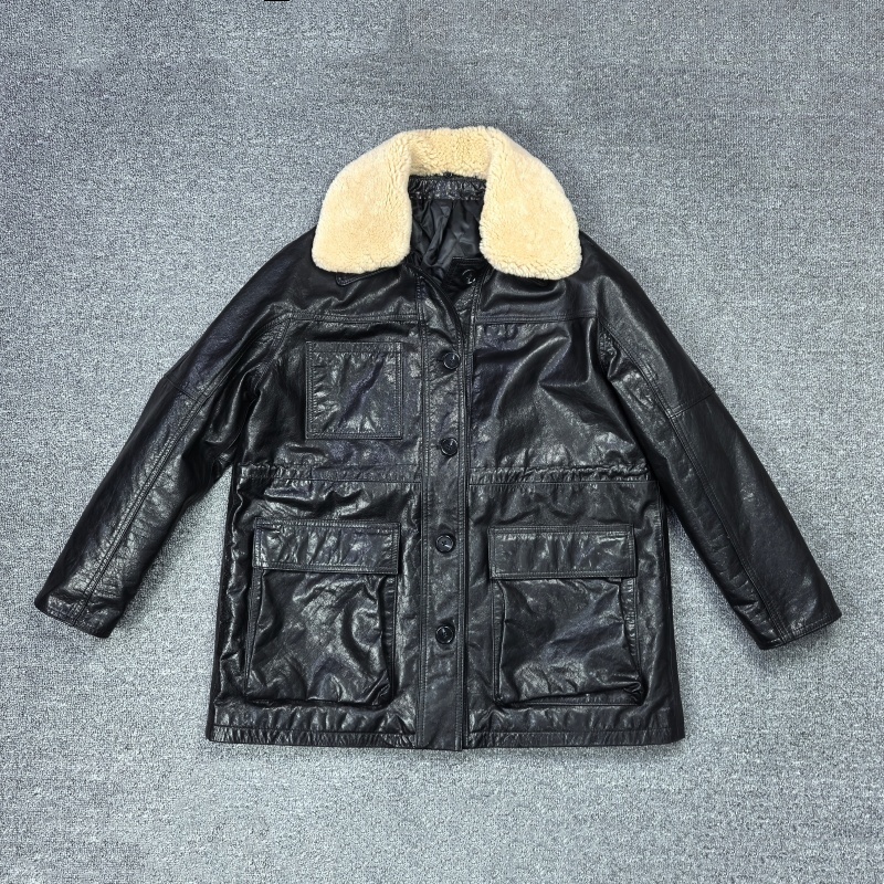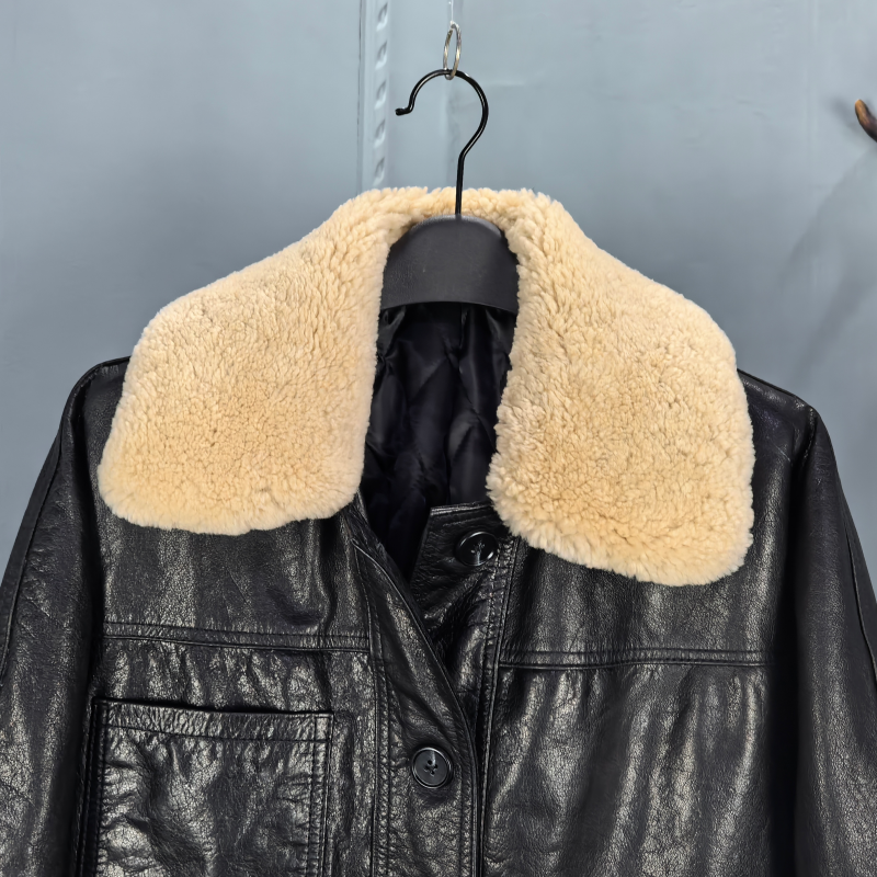 2025秋冬新款真皮皮衣女羊羔毛领中长款牛皮油蜡风衣外套