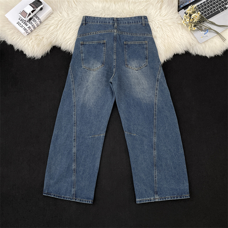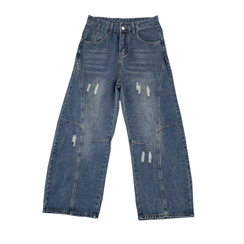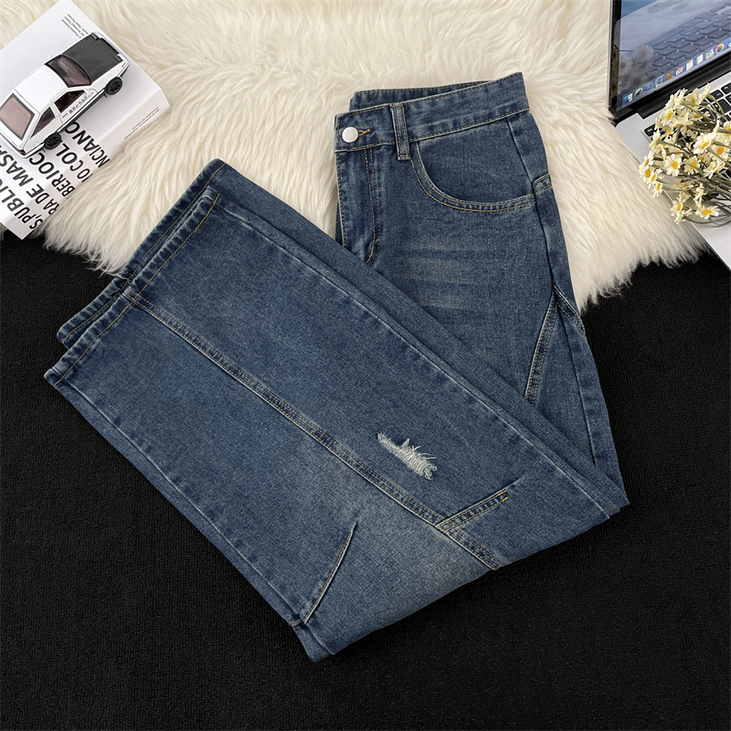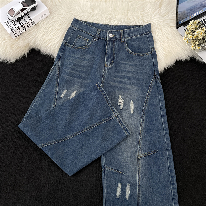 美式割烂破洞弯刀牛仔裤男女微喇设计感宽松解构直筒阔腿显瘦长裤