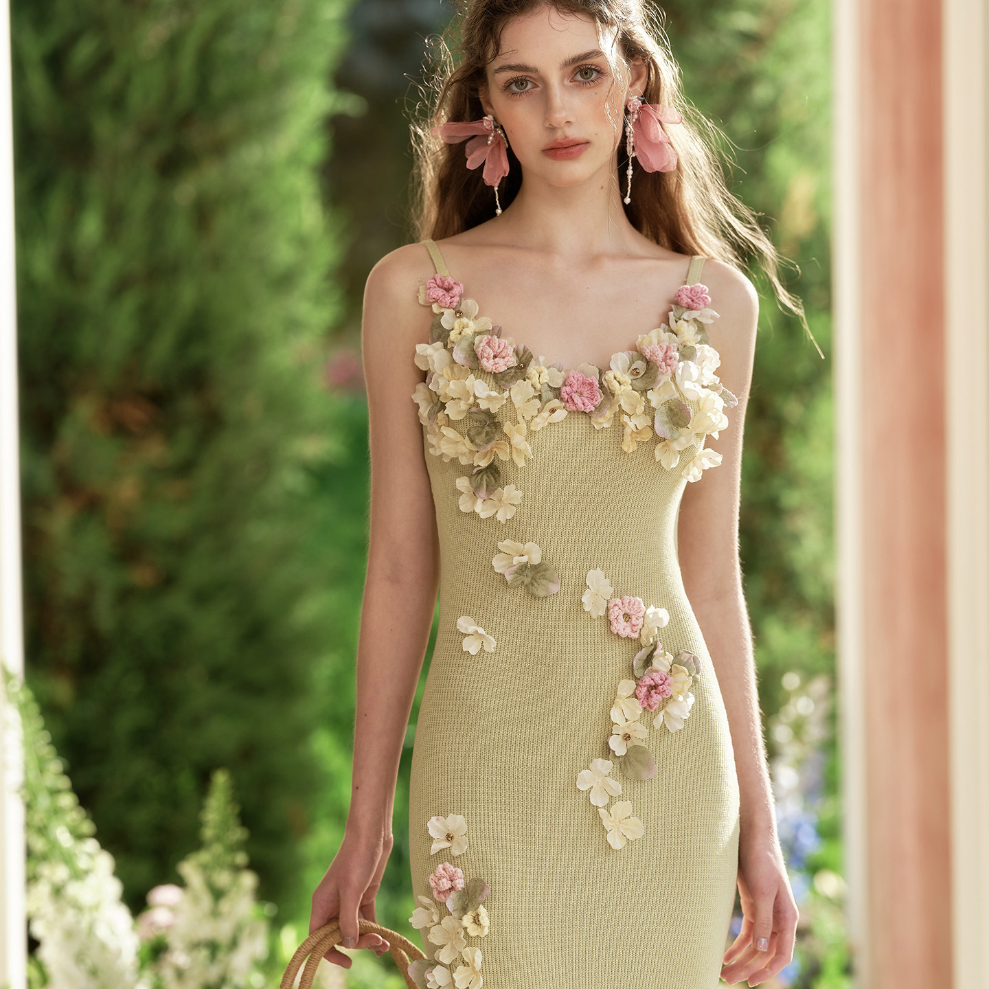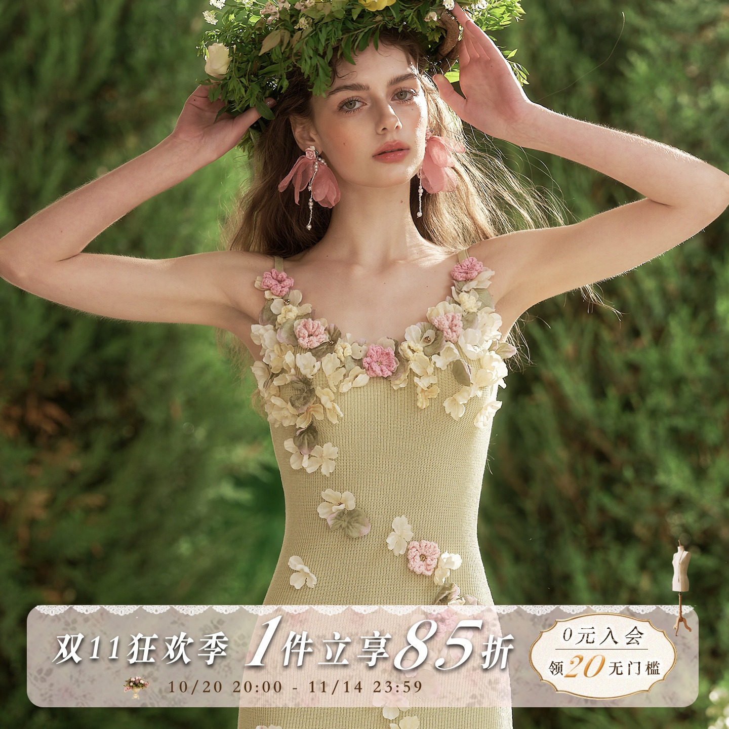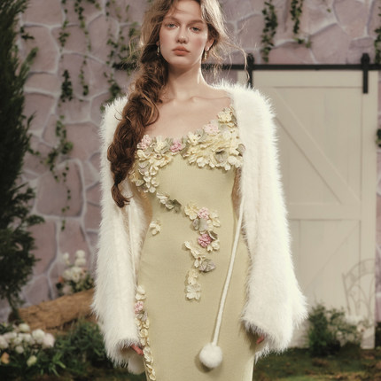 LaceMade 格林香颂 法式重工设计感花朵毛针织吊带绿色开叉连衣裙
