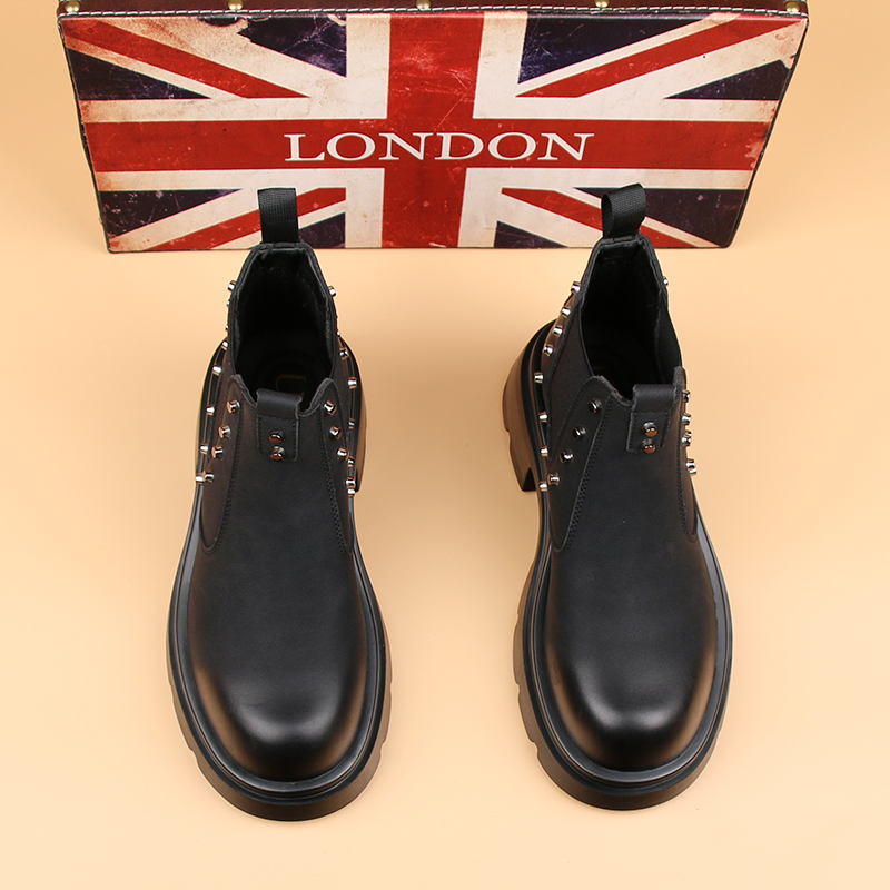 铆钉尖头欧美男士短靴子马丁靴套脚增高潮靴发型师青年皮鞋机车靴