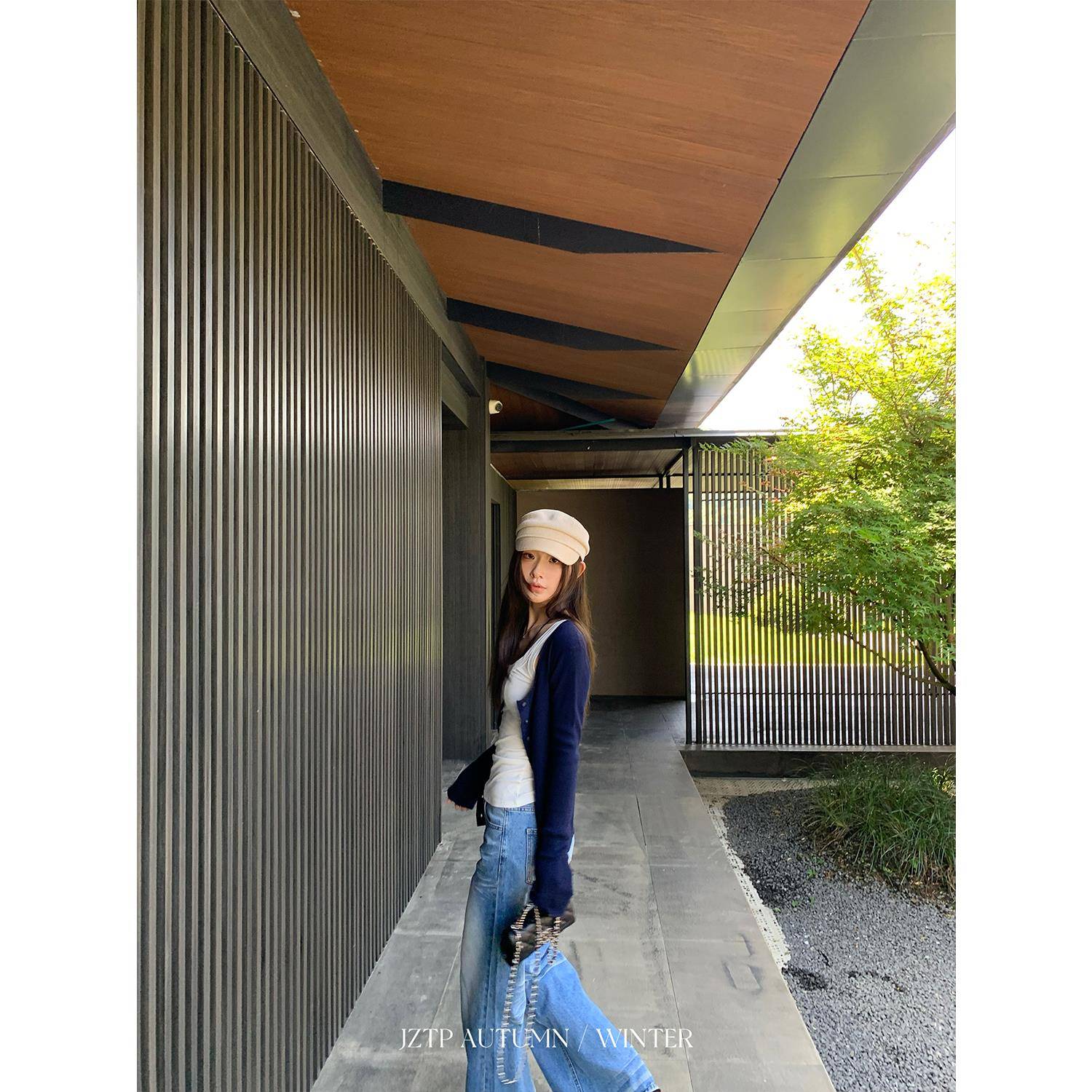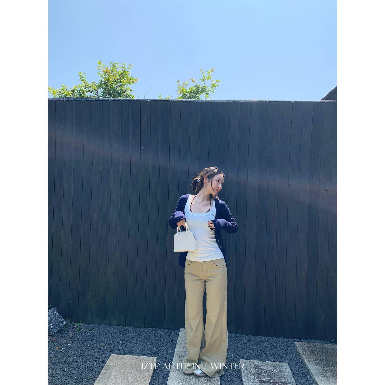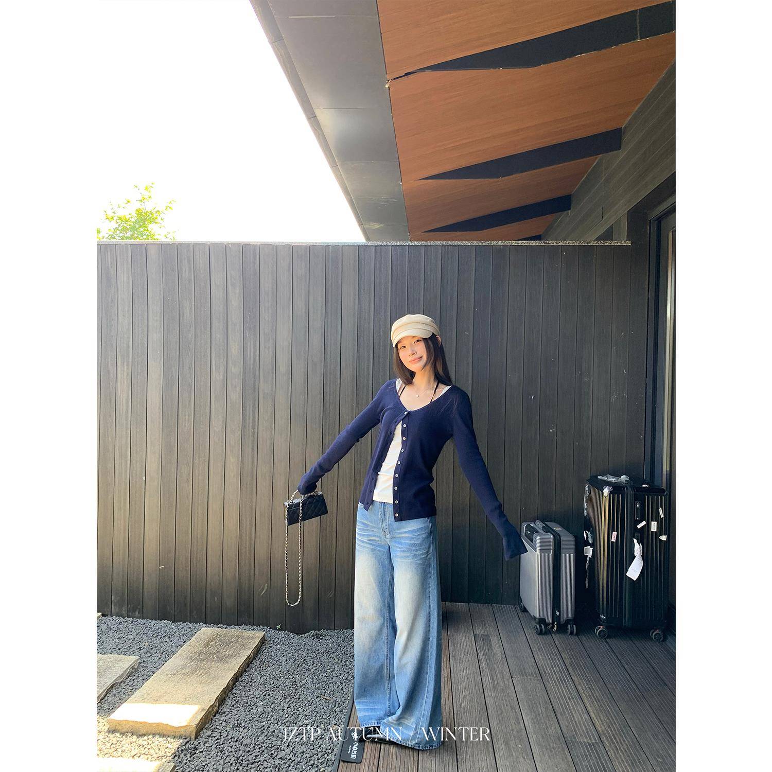 禁止桃跑 含桑蚕丝羊毛修身藏青针织开衫慵懒小喇叭袖上衣外套女