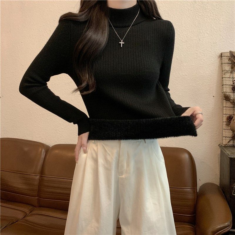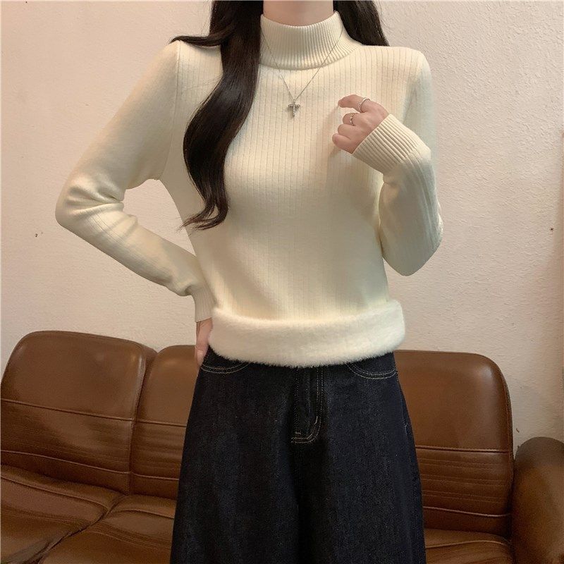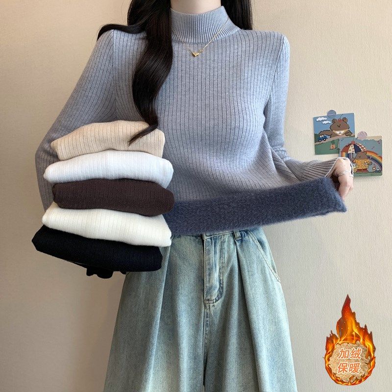 灰色毛衣女秋冬半高领长袖打底针织衫冬季内搭加厚一体绒保暖上衣