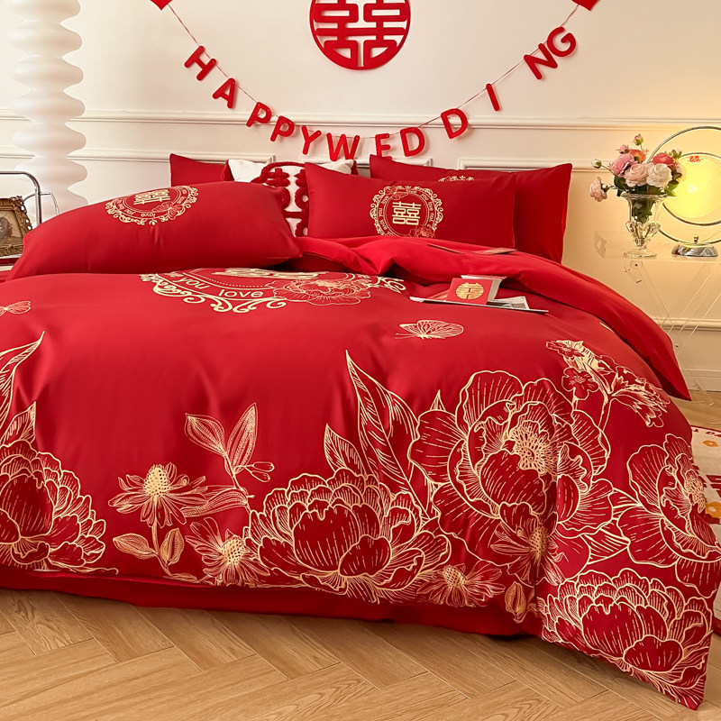 婚庆四件套大红色高级感被套床单全棉新婚房喜被结婚床上用品