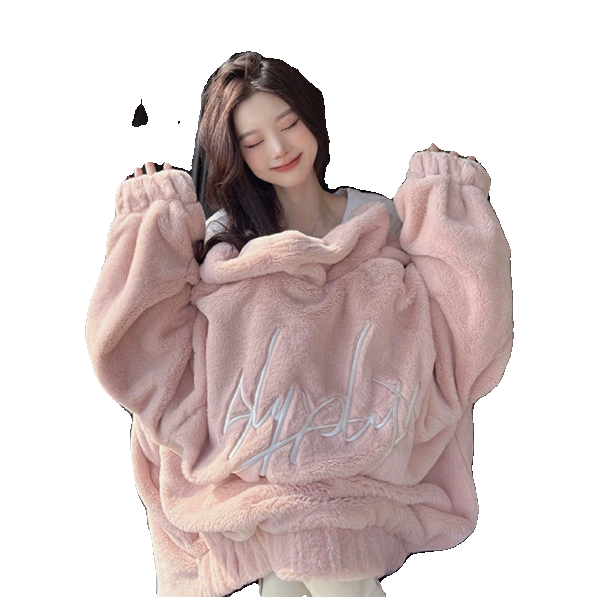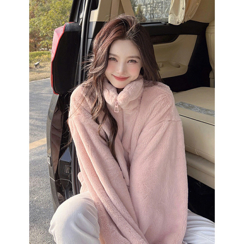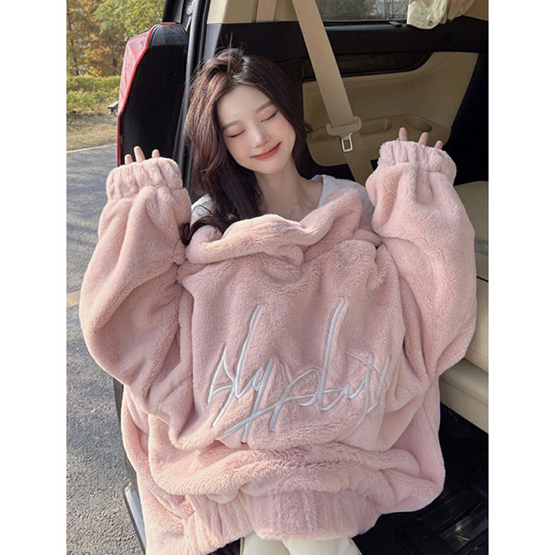 秋冬加绒加厚粉色羊羔毛外套卫衣女款2025新款爆款宽松中长款上衣
