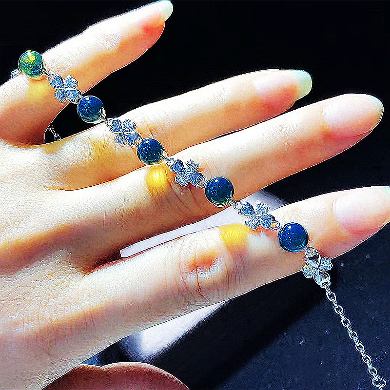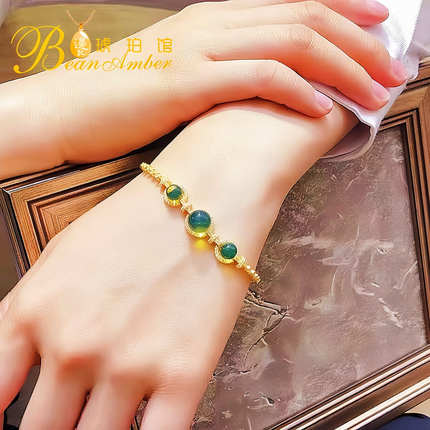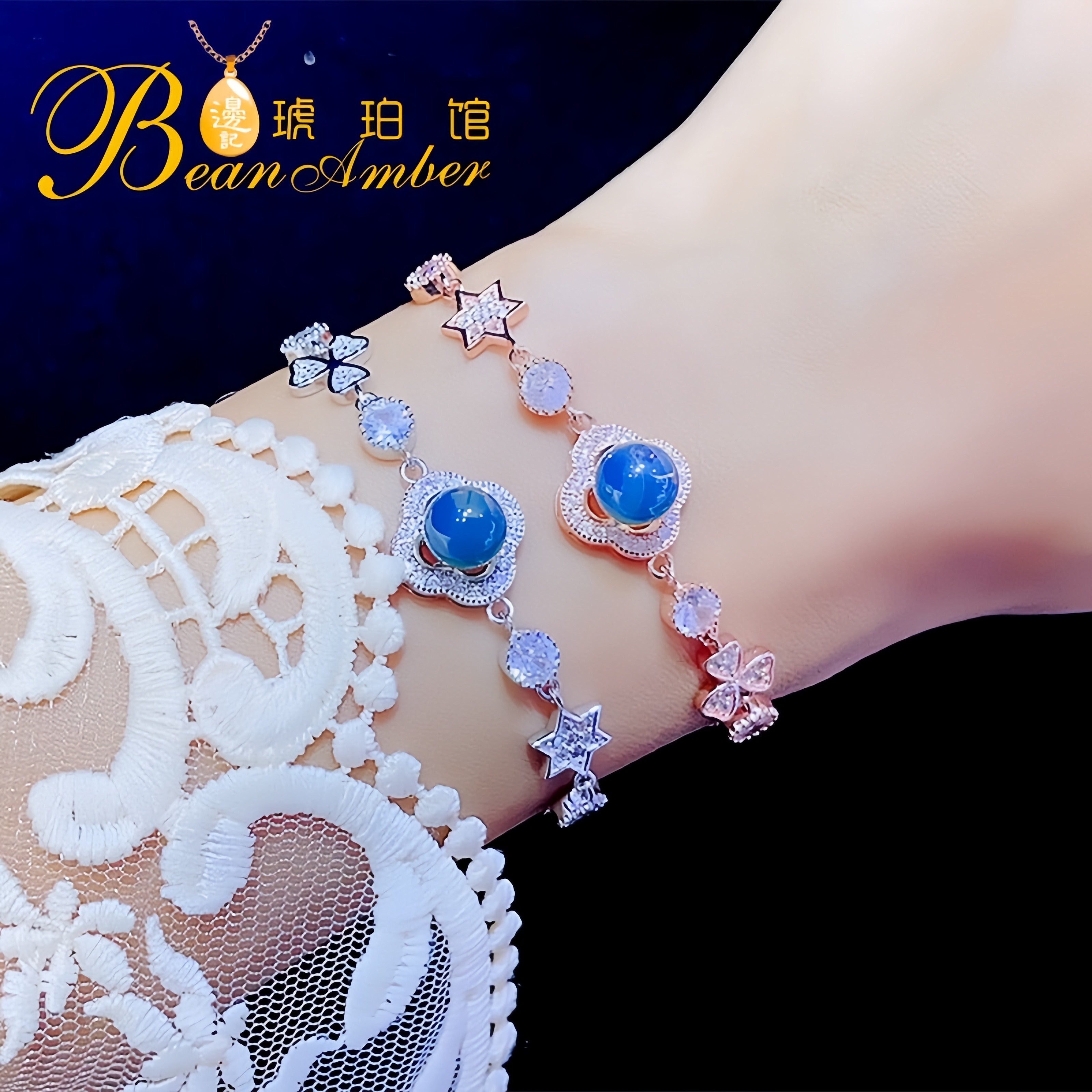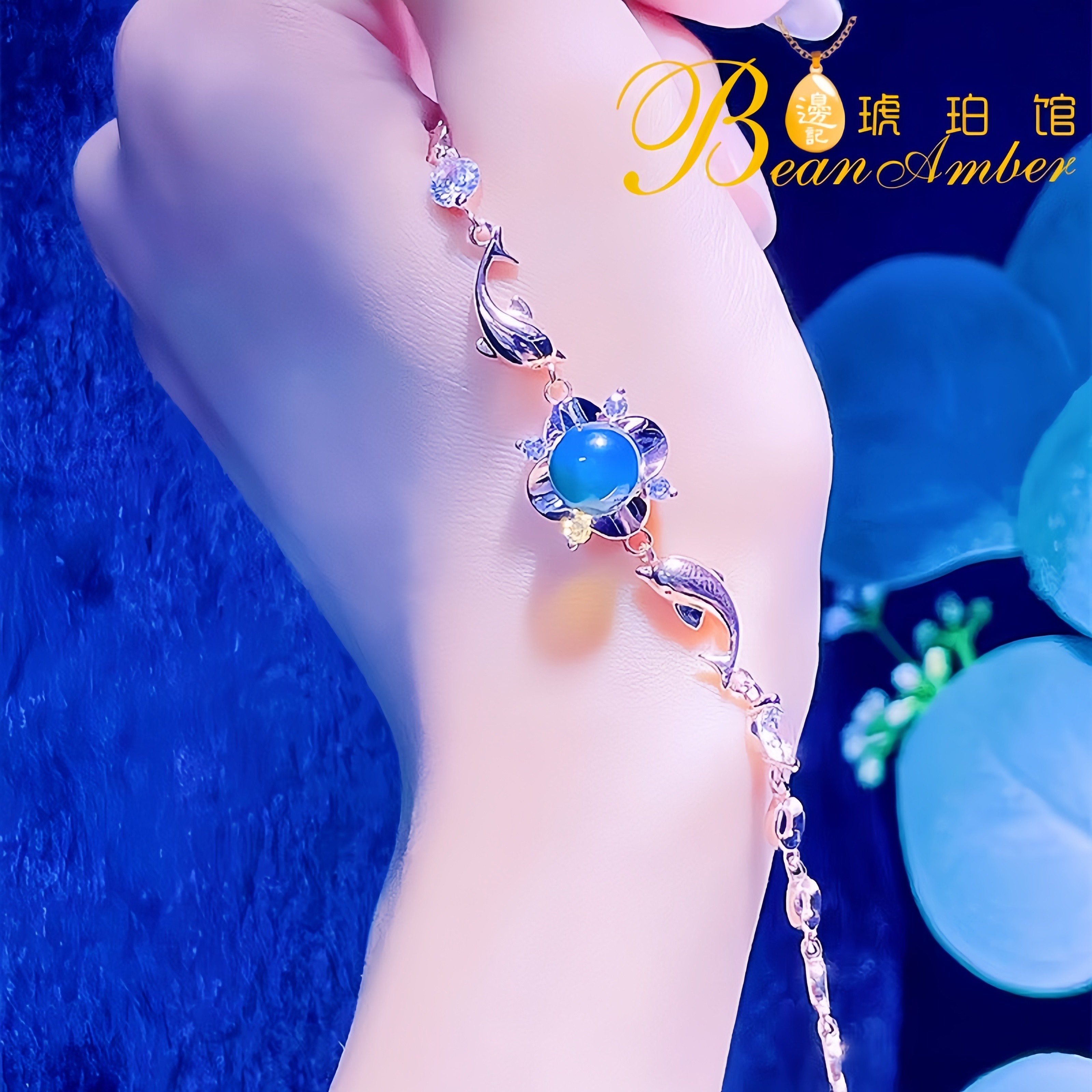 边记琥珀戴妃四叶草墨西哥蓝珀手链纯银S925葫芦海豚满天星珠串女