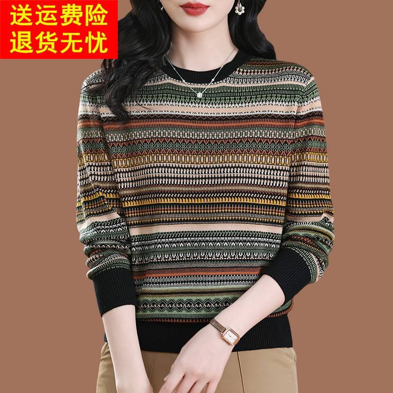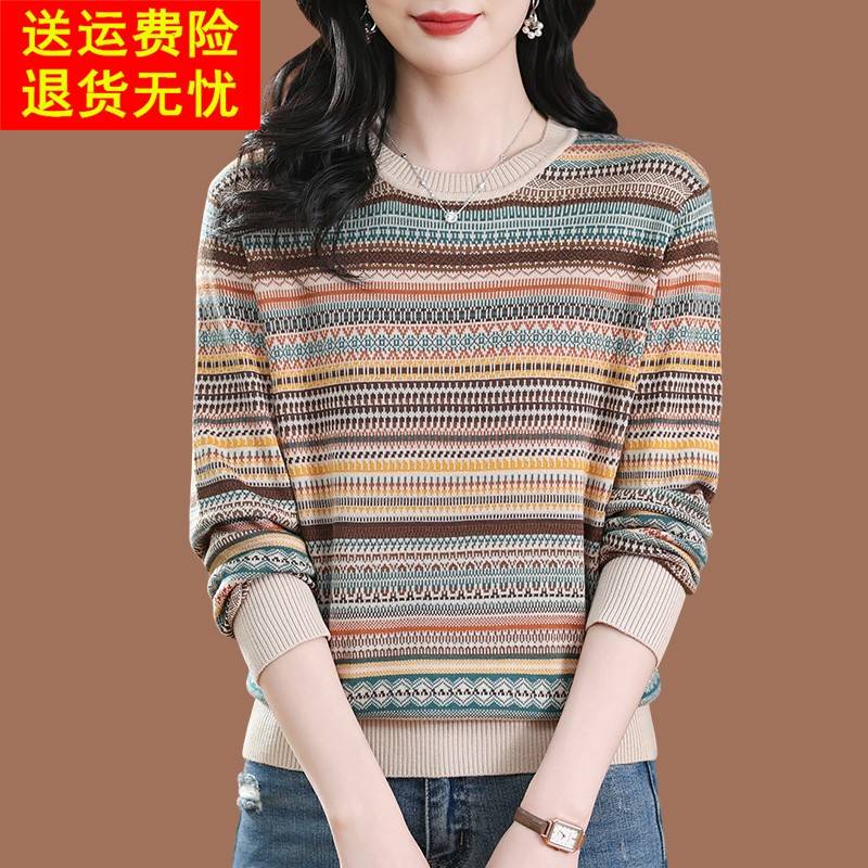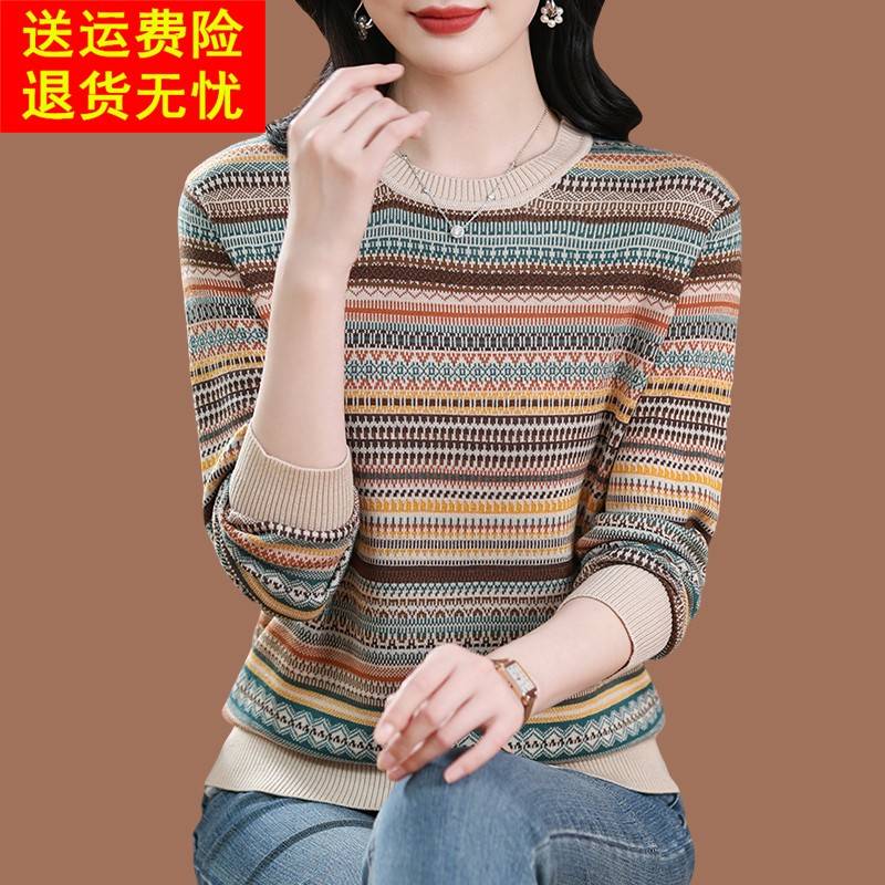 高端条纹桑蚕丝长袖T恤女春装新款妈妈可外穿上衣天丝针织打底衫