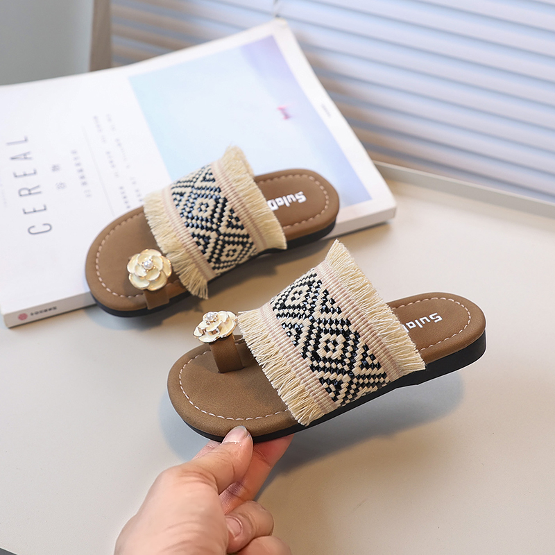 女童拖鞋夏季新款外穿波西米亚风海边女宝宝流苏夹趾凉拖平底凉鞋
