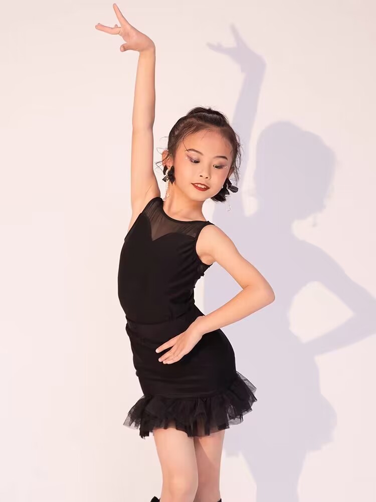 儿童拉丁舞服装2024新款练功服长袖女网红黑色无袖拉丁舞裙演出服