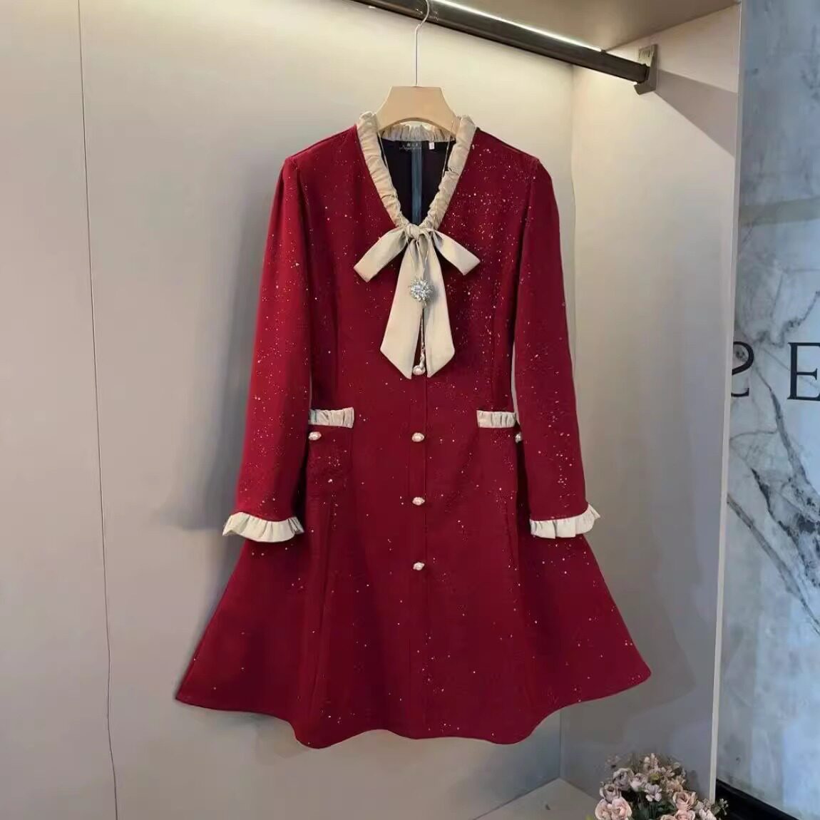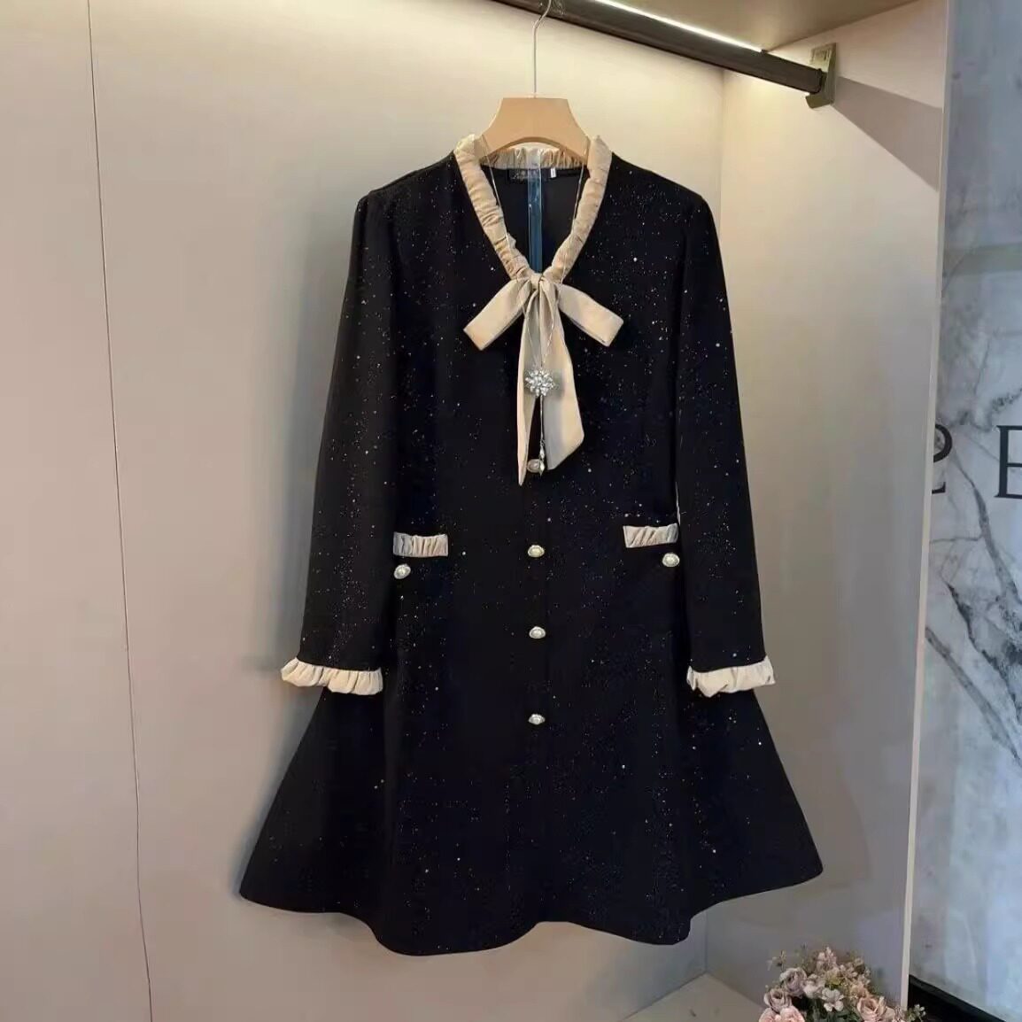 大码胖mm冬季新款韩系小香风气质领结装饰显瘦连衣裙名媛轻奢裙子