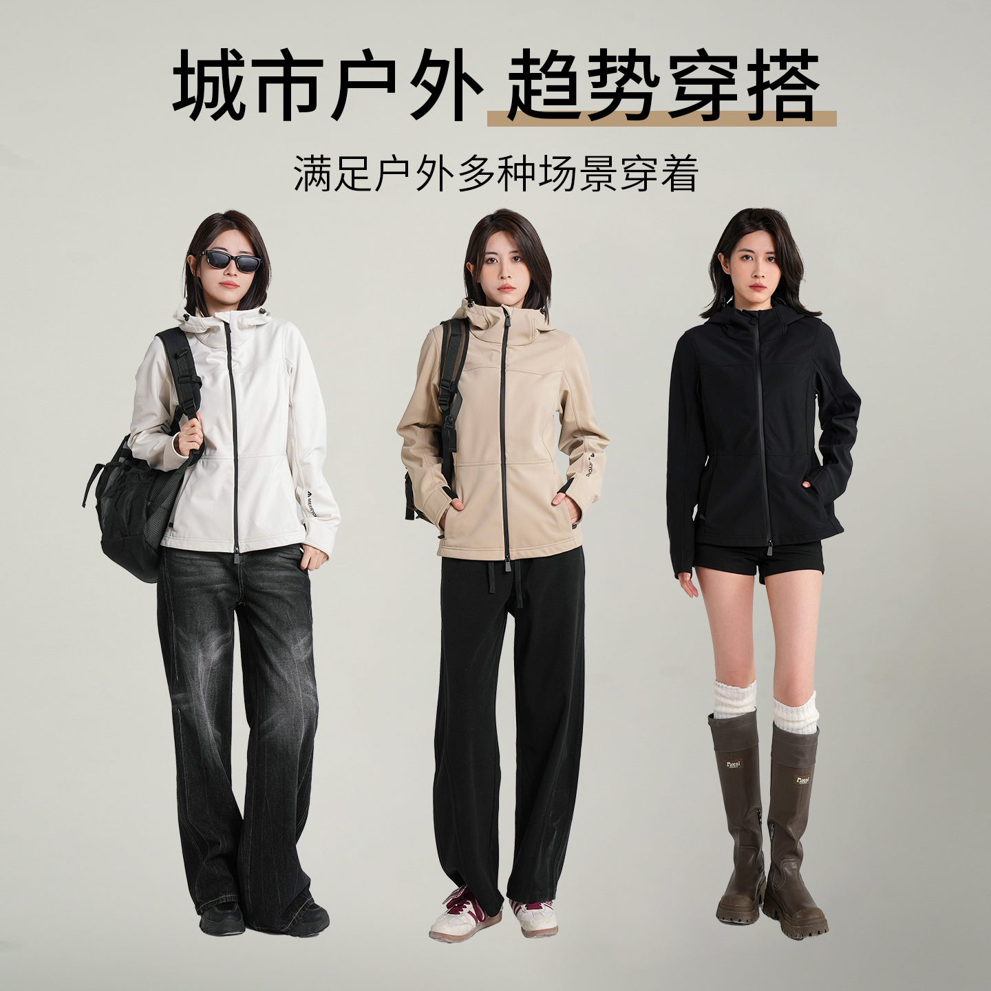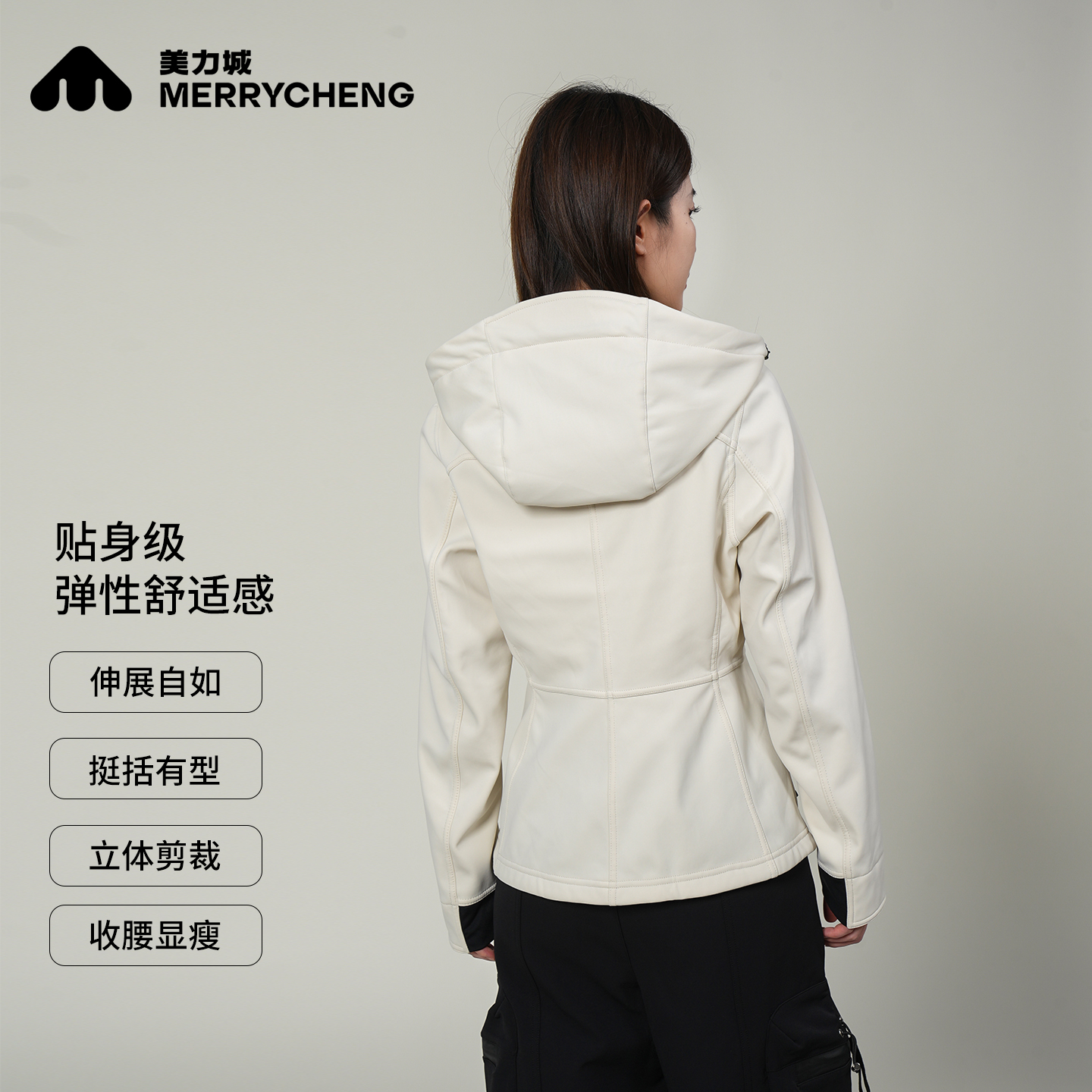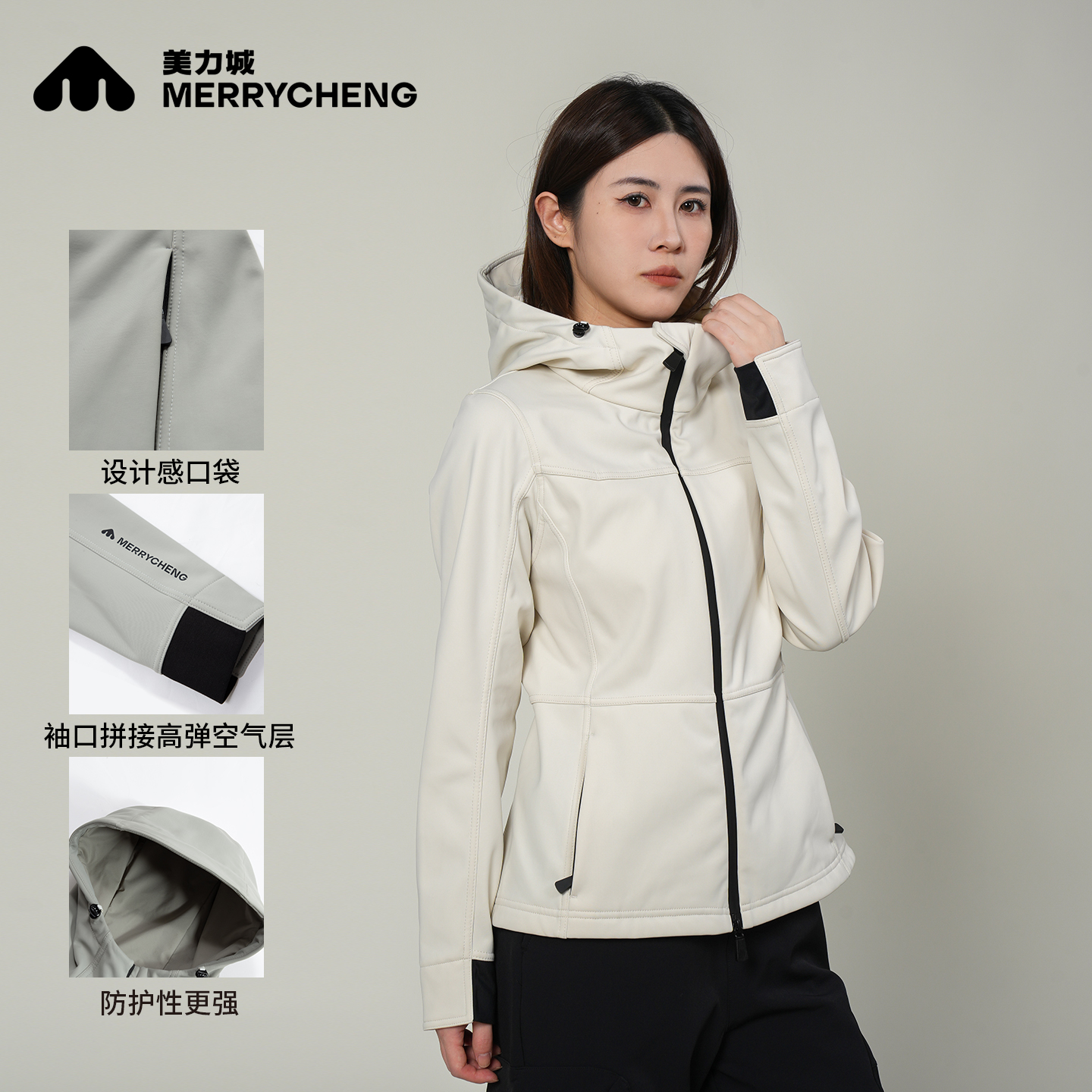 美力城外套女2025年秋冬新款户外休闲运动防泼水加厚连帽软壳衣