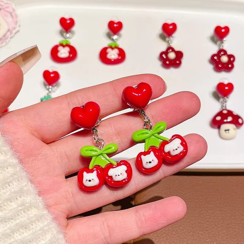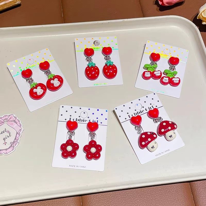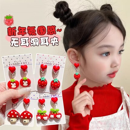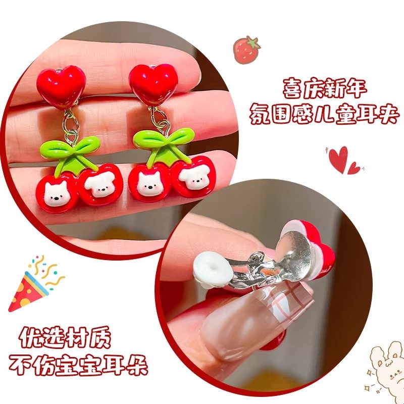 儿童卡通兔子耳夹女童可爱无耳洞耳钉耳饰宝宝新年红色耳坠花朵