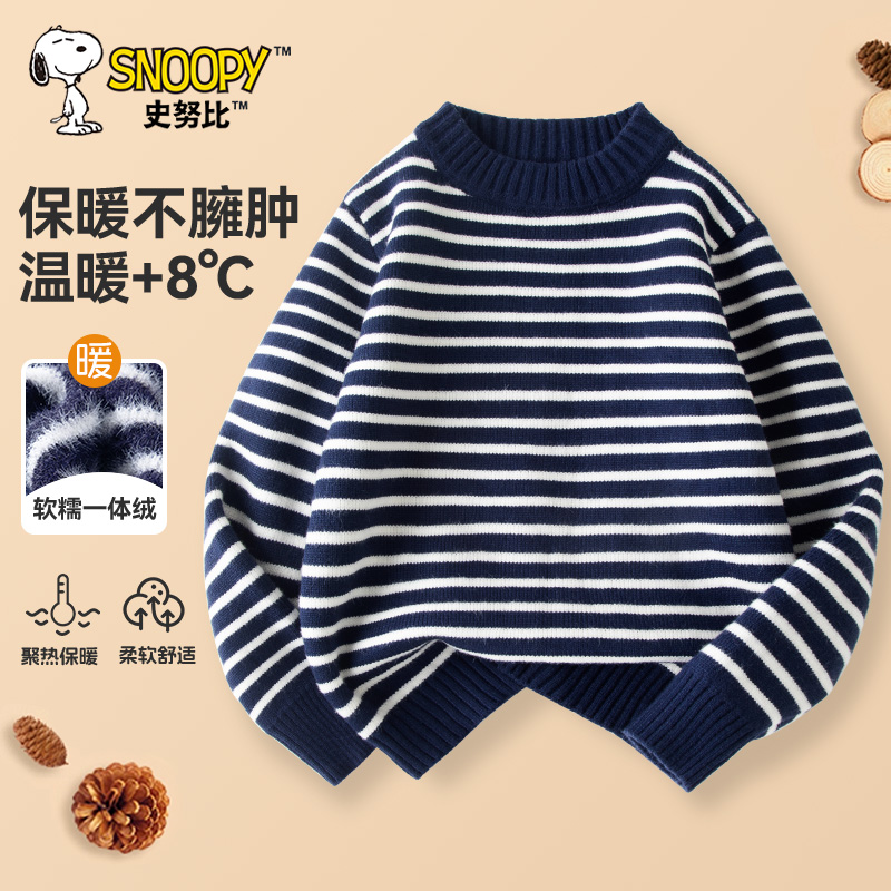 史努比儿童毛衣加绒加厚秋冬装男大童冬装上衣男童保暖条纹毛线衣