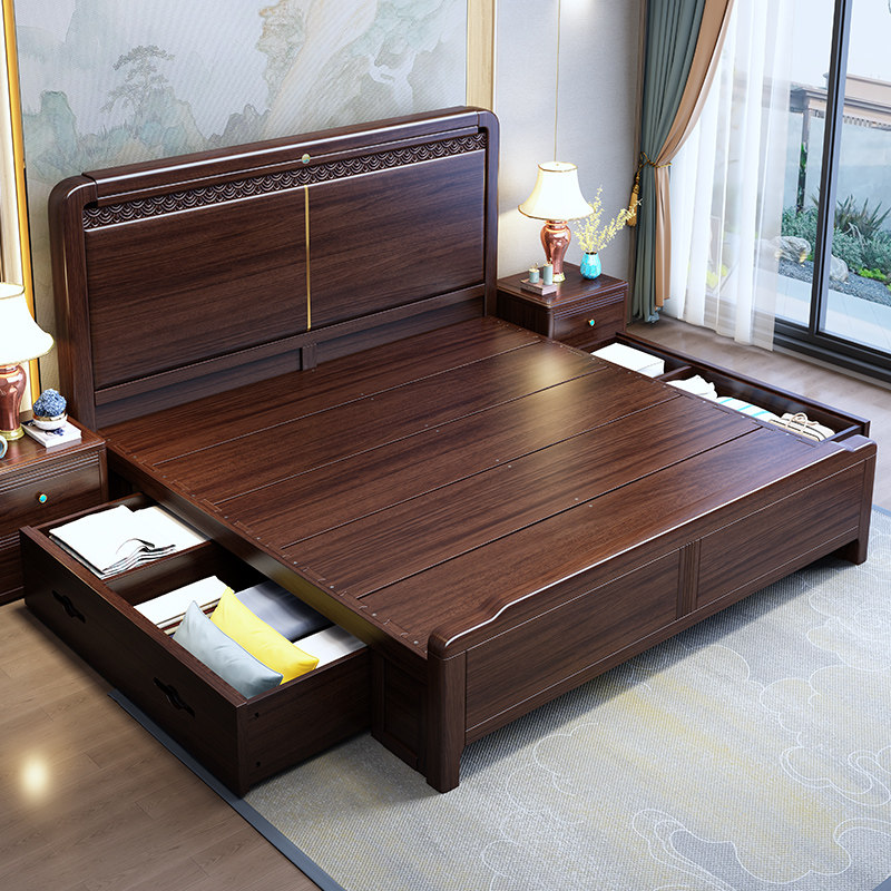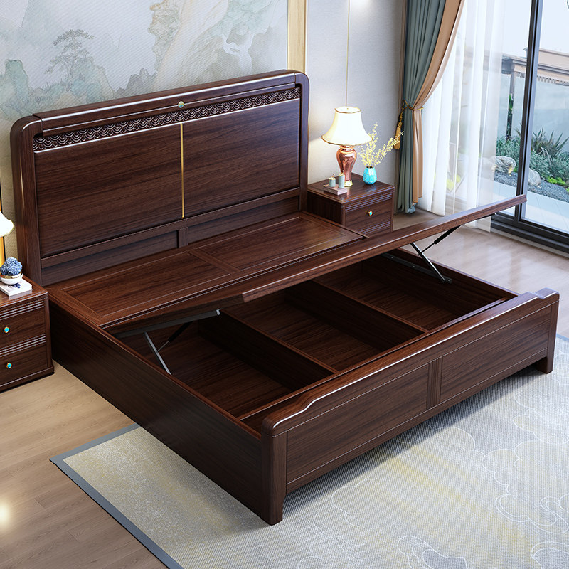 新中式全实木床1.8米1.5卧室国风高箱储物双人满铺床板乌金木婚床