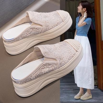 厚底包头渔夫鞋女款2025春夏内增高7CM坡跟裸色松糕休闲网面凉拖