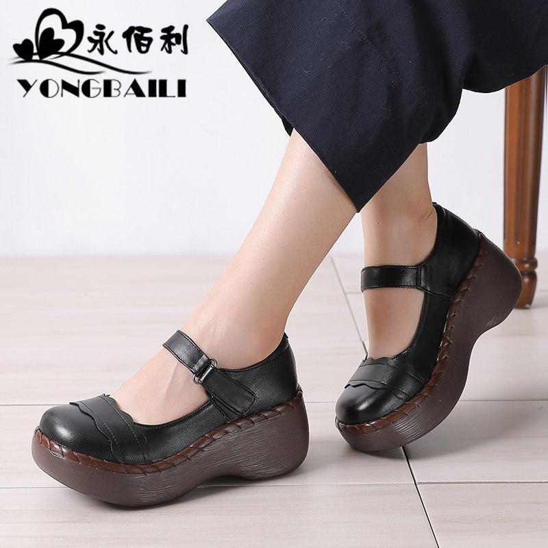春秋新款原创复古牛皮松糕单鞋女防水台坡高跟厚底妈妈鞋皮鞋女鞋