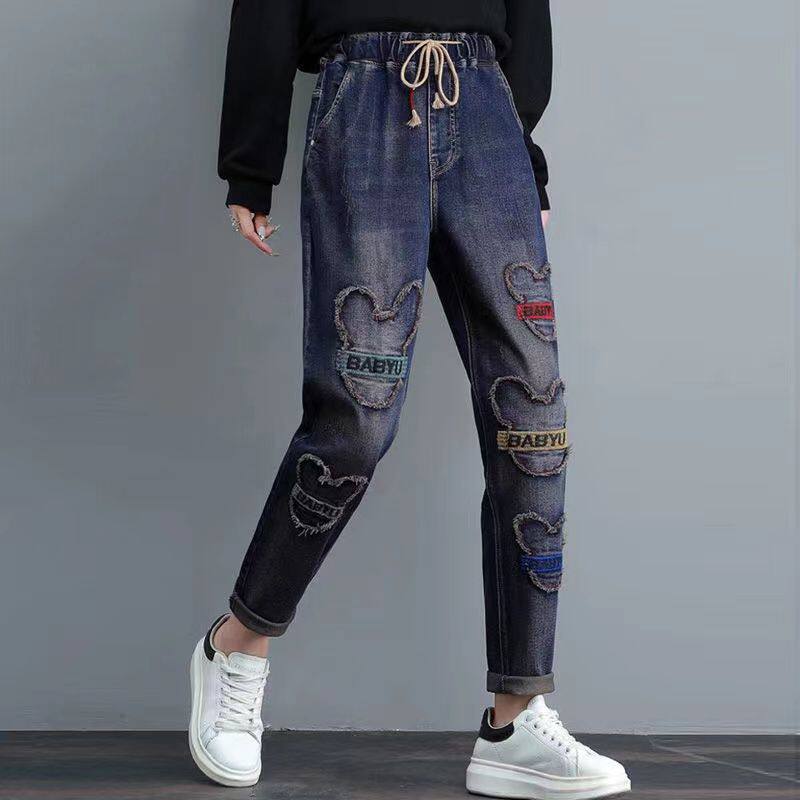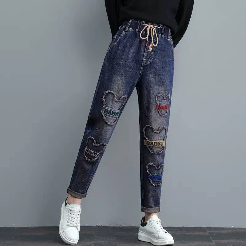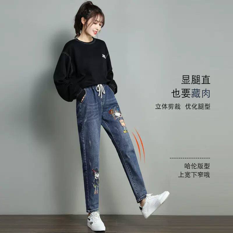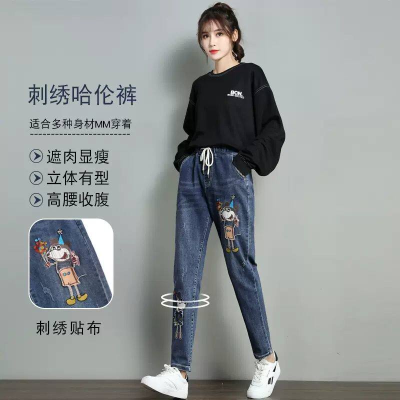 胖mm大码牛仔裤女高腰宽松显瘦萝卜裤刺绣松紧腰百搭休闲哈伦裤潮