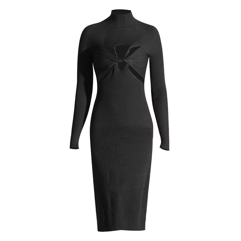 性感辣妹风针织裙2025设计感镂空扭结修身显瘦中长款连衣裙女立领