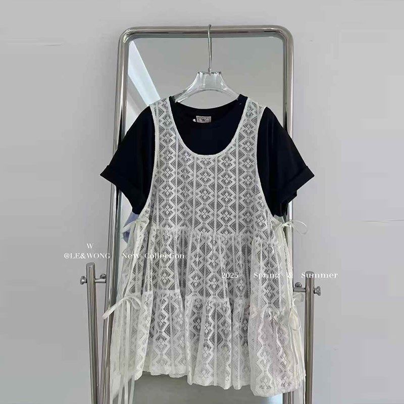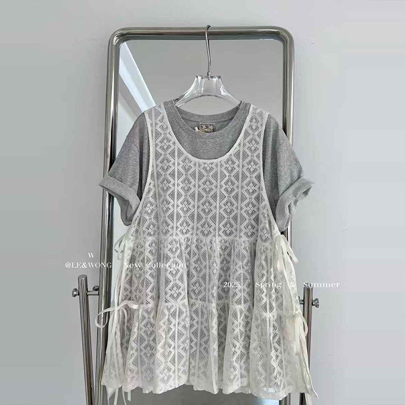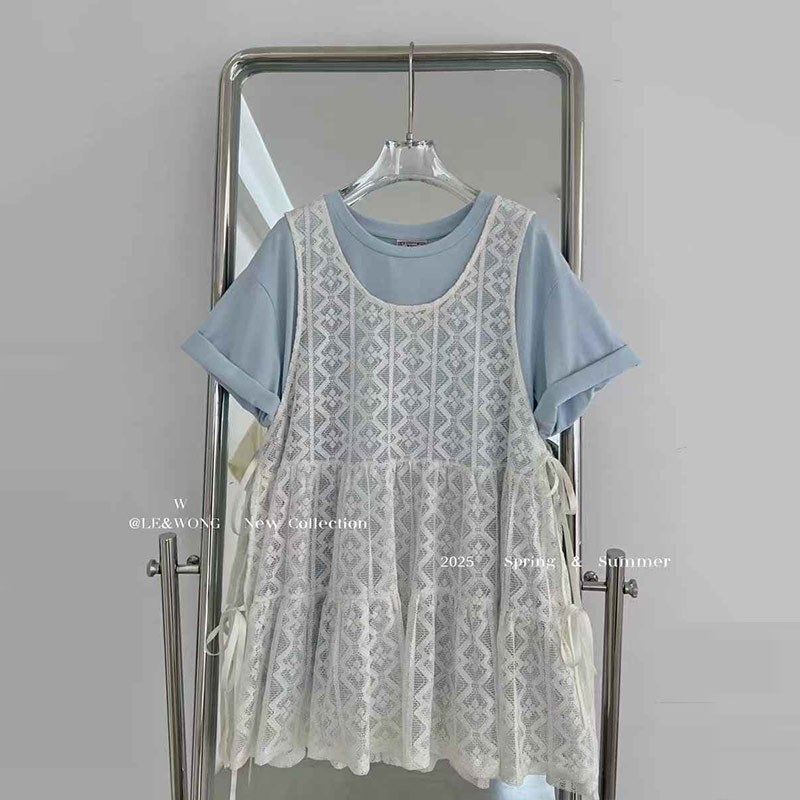 加肥女圆领短袖T恤衫衫蕾丝花朵背心胖妹妹韩版夏U季款休闲两件套