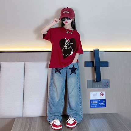 女童夏装套装2024新款韩版夏季大童洋气网红儿童短袖牛仔裤两件套