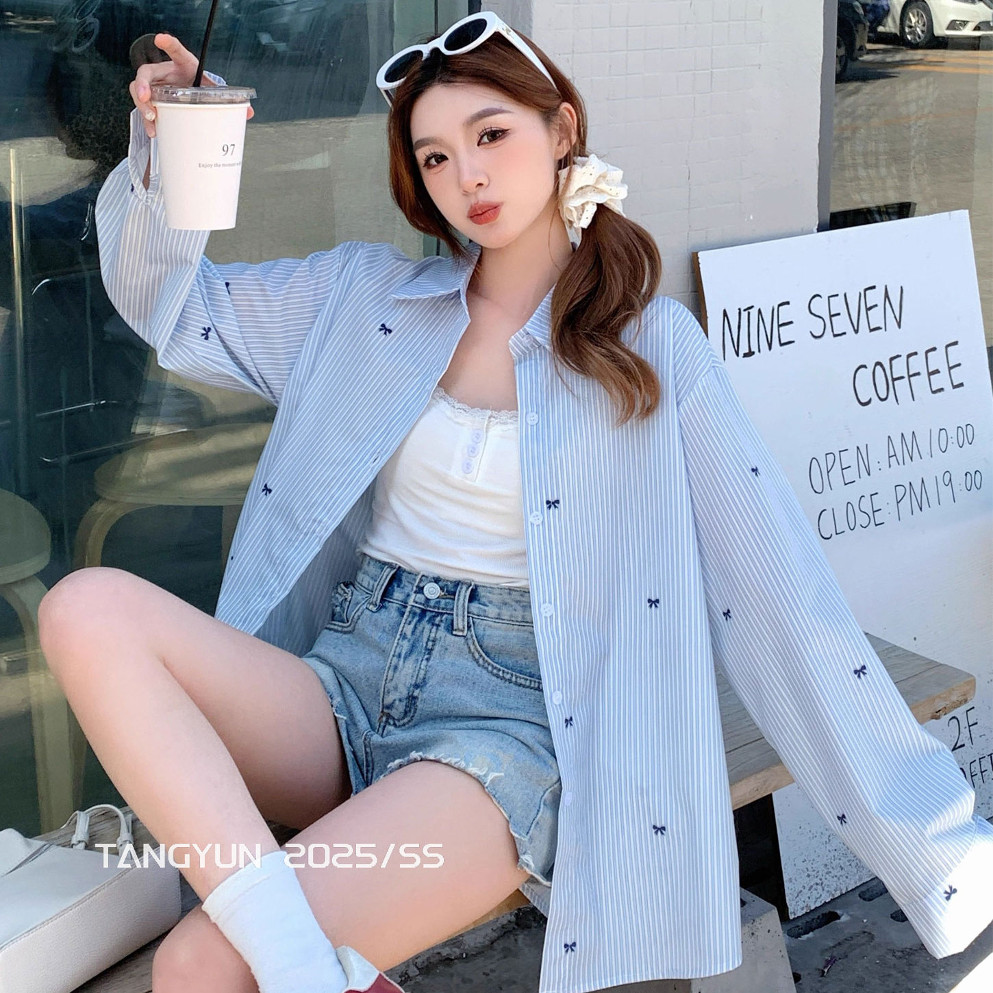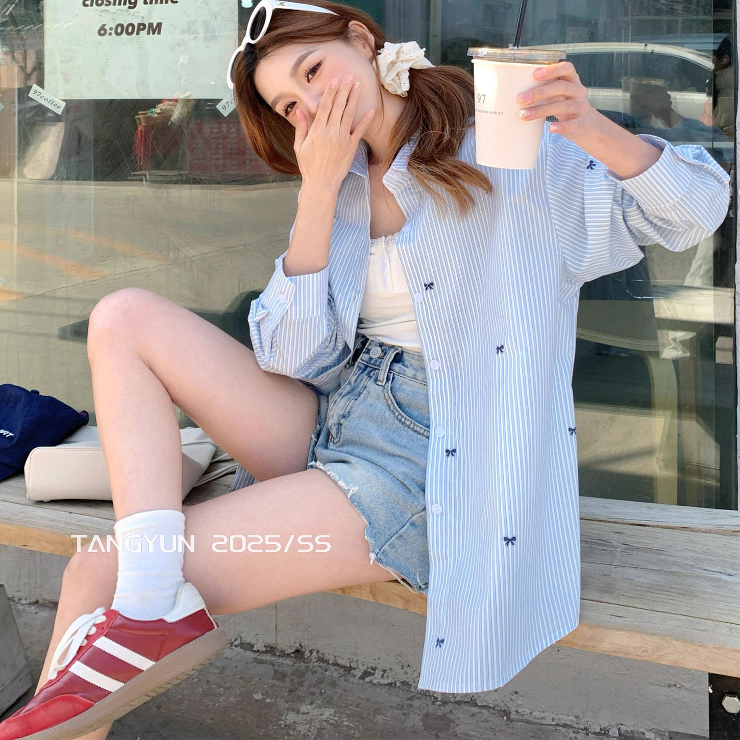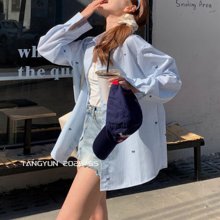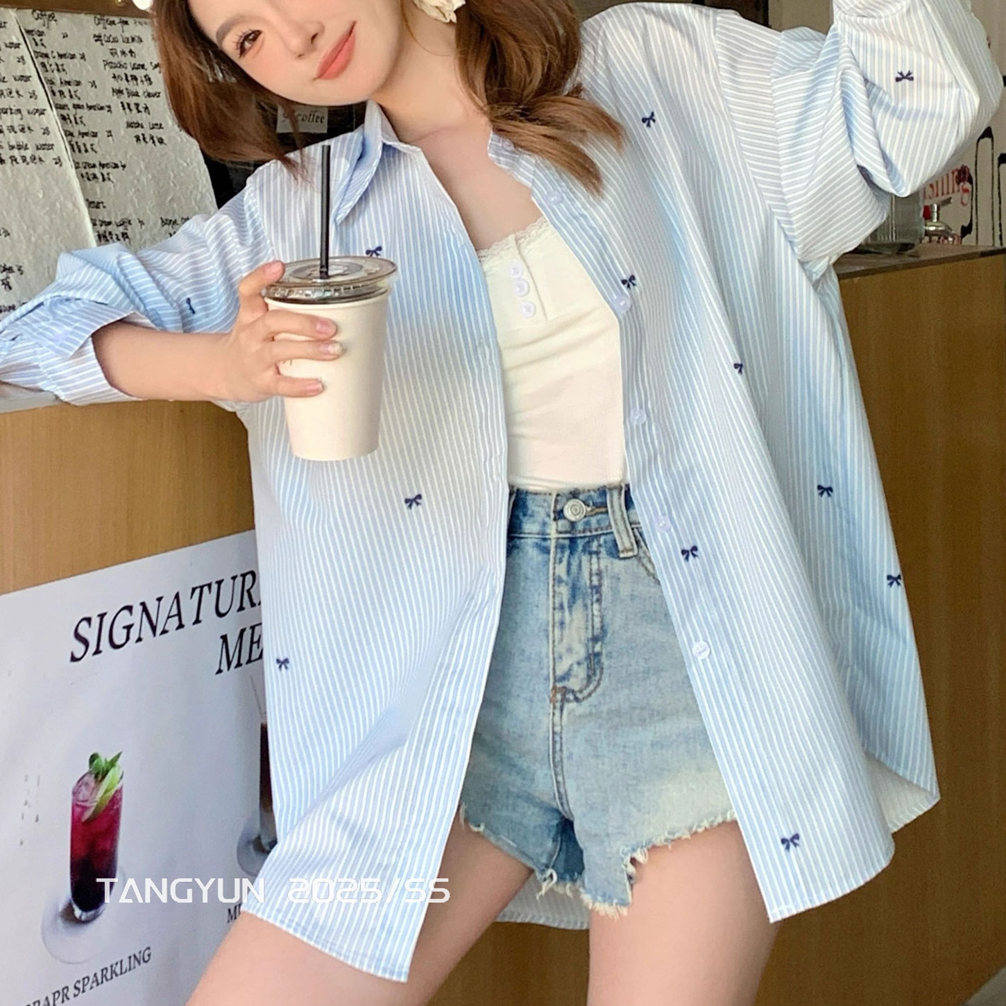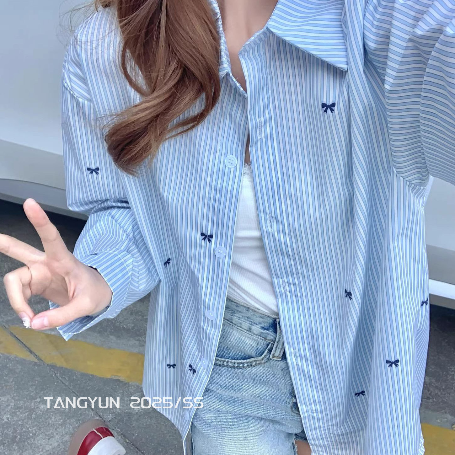 TANG蝴蝶结印花衬衫女2025年夏季宽松长袖浅蓝色条纹防晒衬衣上衣