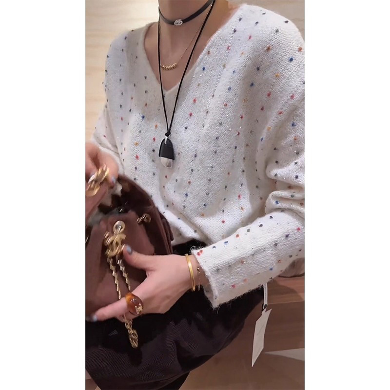 法式V领重工亮片套头毛衣女秋冬季慵懒风针织衫早秋chic别致上衣