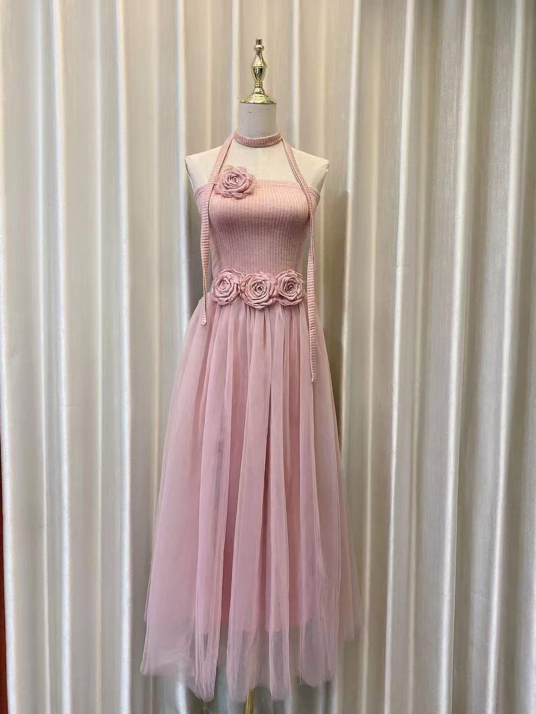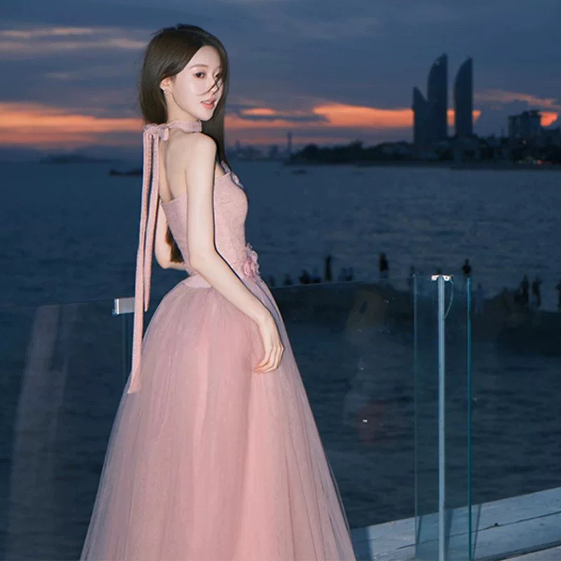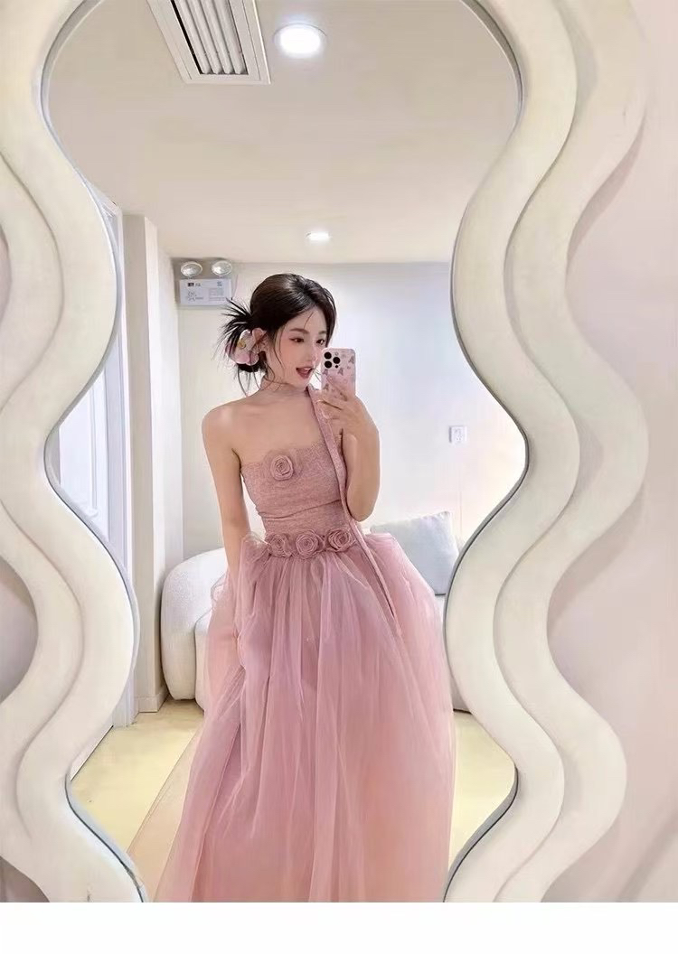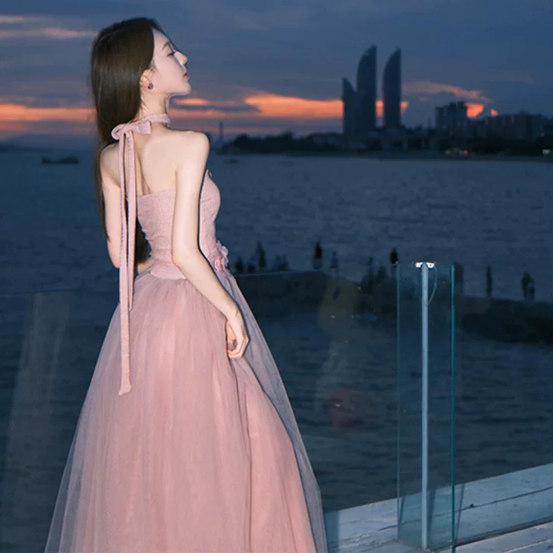 粉色甜美抹胸裙生日晚宴晚礼服轻奢小众收腰连衣裙女夏季气质长裙