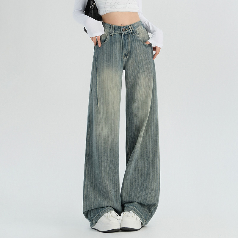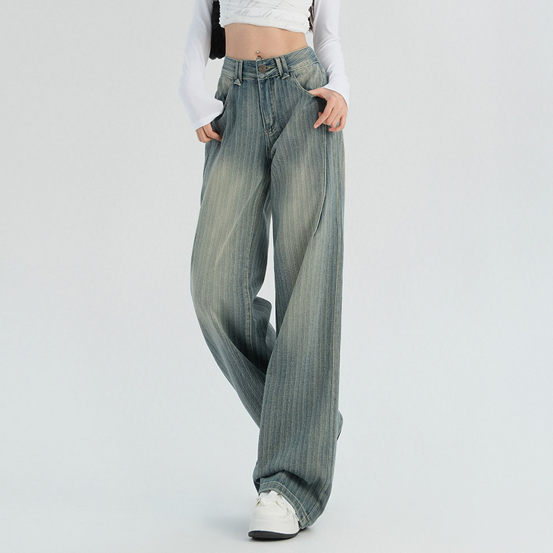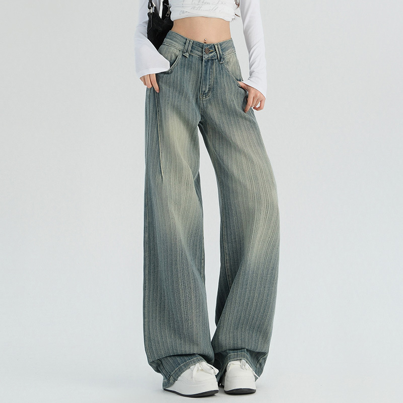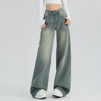 复古阔腿牛仔裤女春秋美式高街高腰条纹宽松百搭慵懒直筒裤子