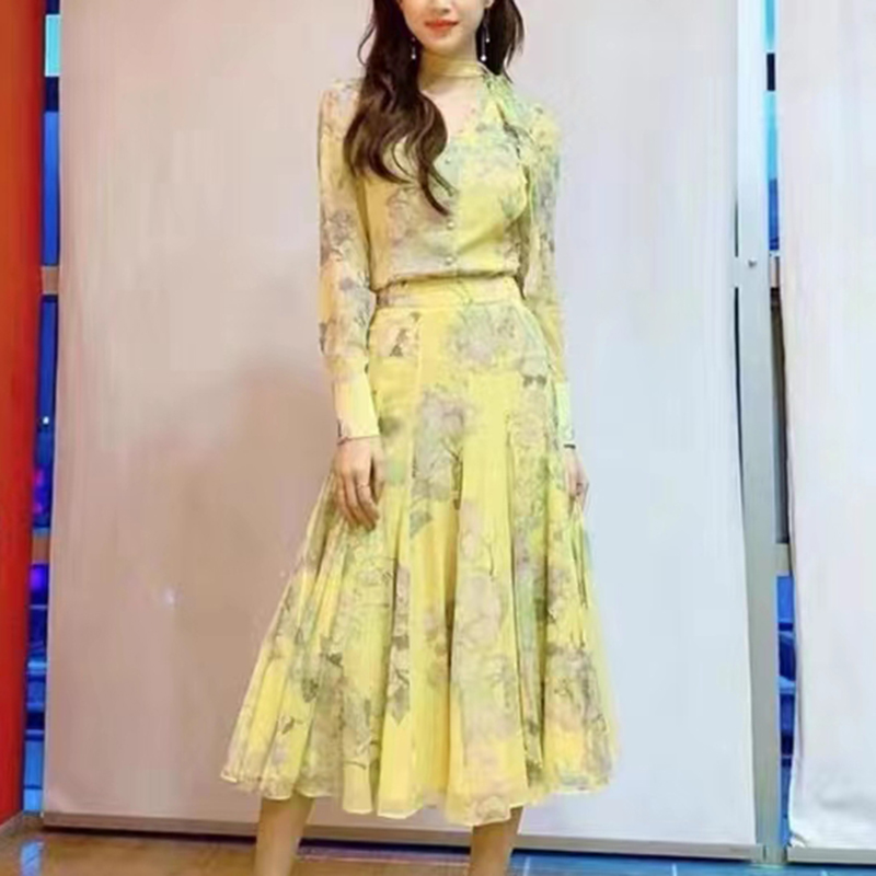 现货裴秀智同款套装印花套装裙长袖系带衬衫+高腰褶皱A字半身裙女