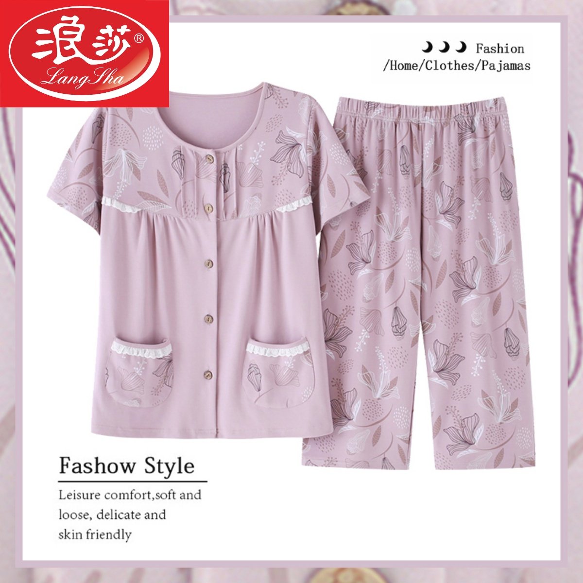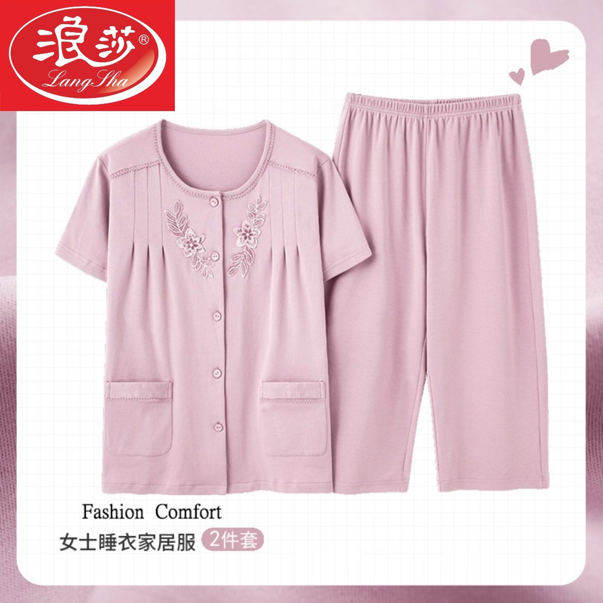 浪莎睡衣女士2025新款夏季纯棉中老年妈妈薄款短袖开衫两件套装