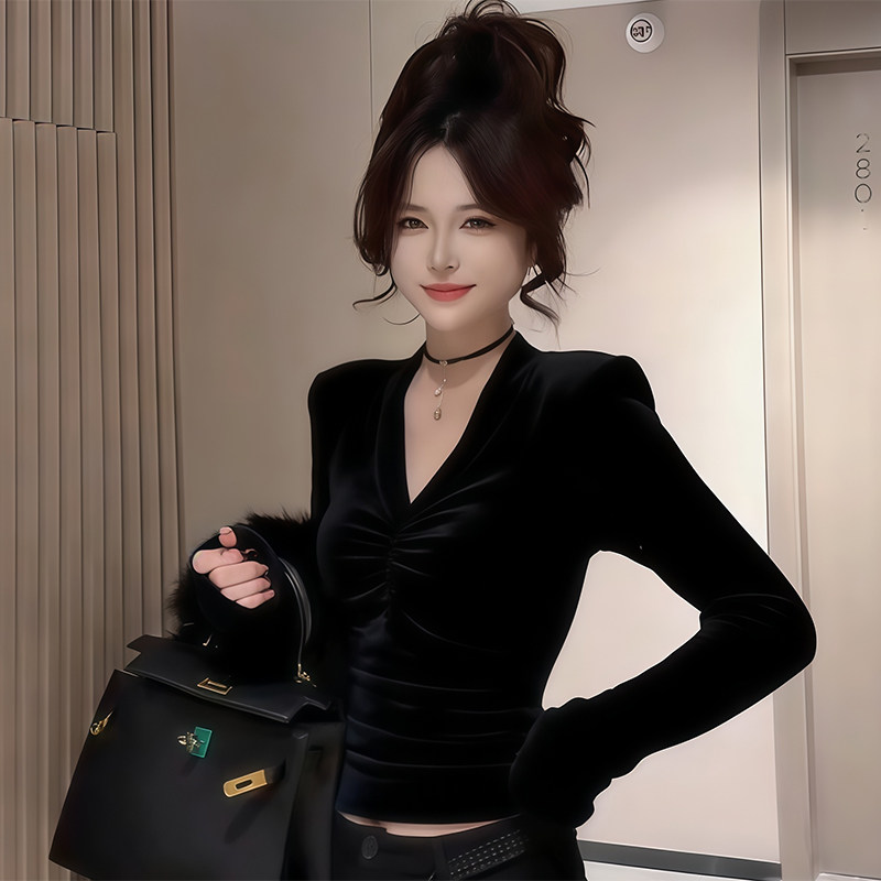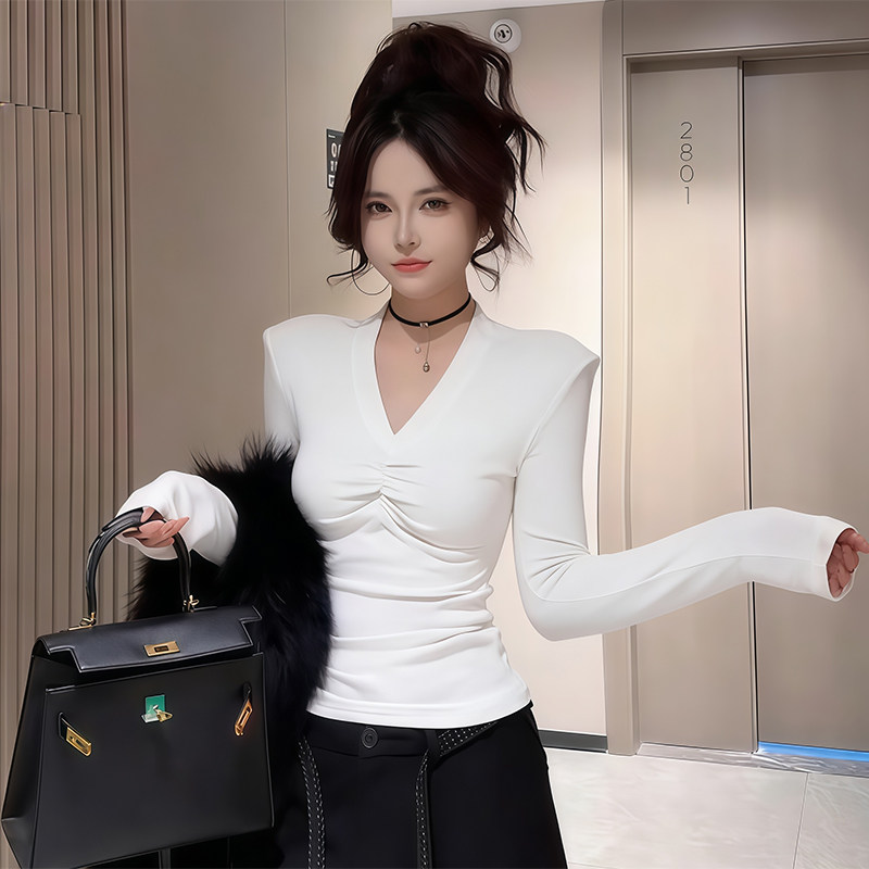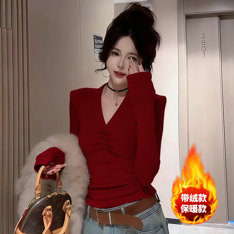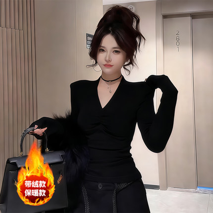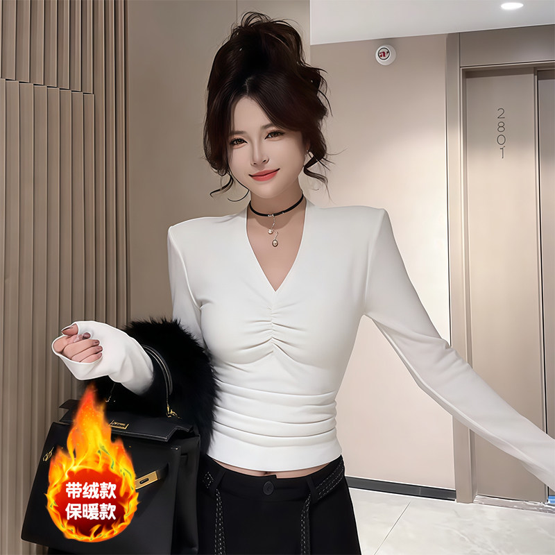 辣妹风V领修身褶皱设计感长袖T恤女秋冬季带绒保暖百搭气质打底衫