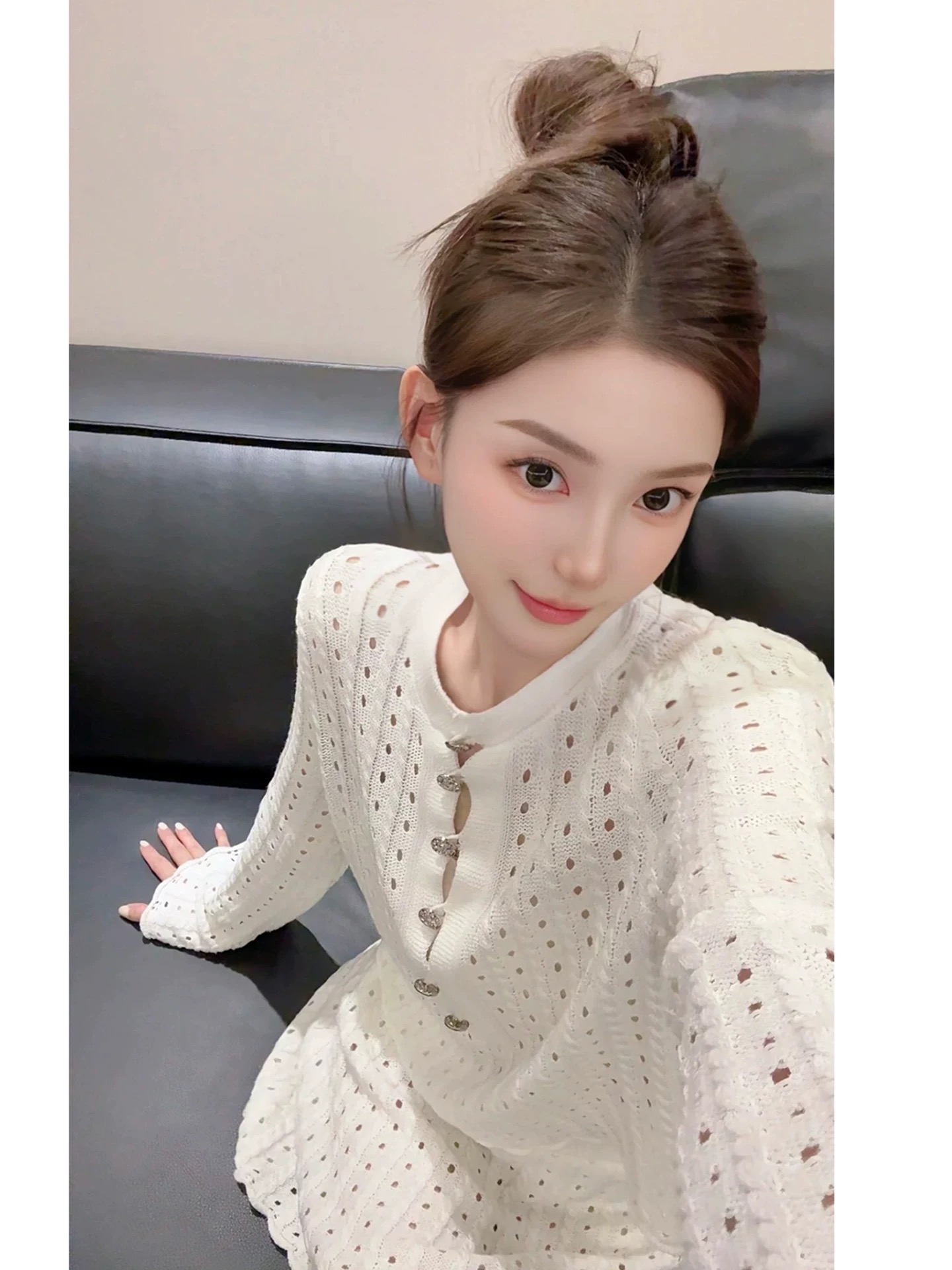 千金名媛法式小香风套装镂空针织长袖上衣短裙白色两件套女秋新款