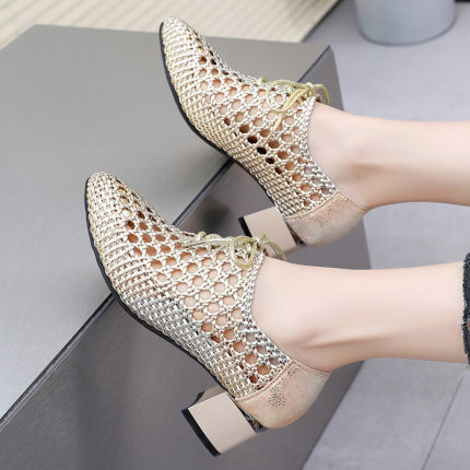 凉鞋女粗跟镂空单鞋夏季鞋子2025新款真皮中跟女鞋渔夫鞋编织网鞋