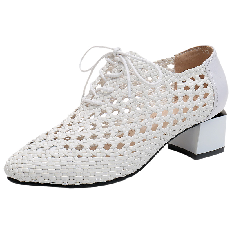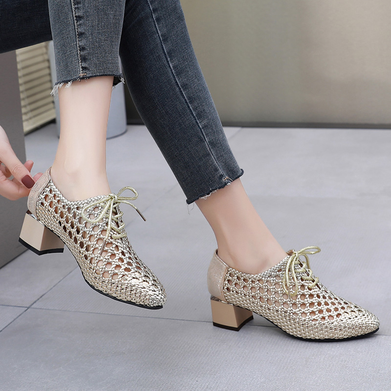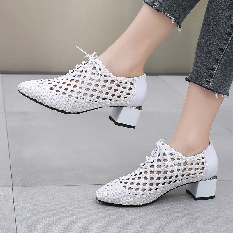 镂空夏季真皮中跟编织凉鞋