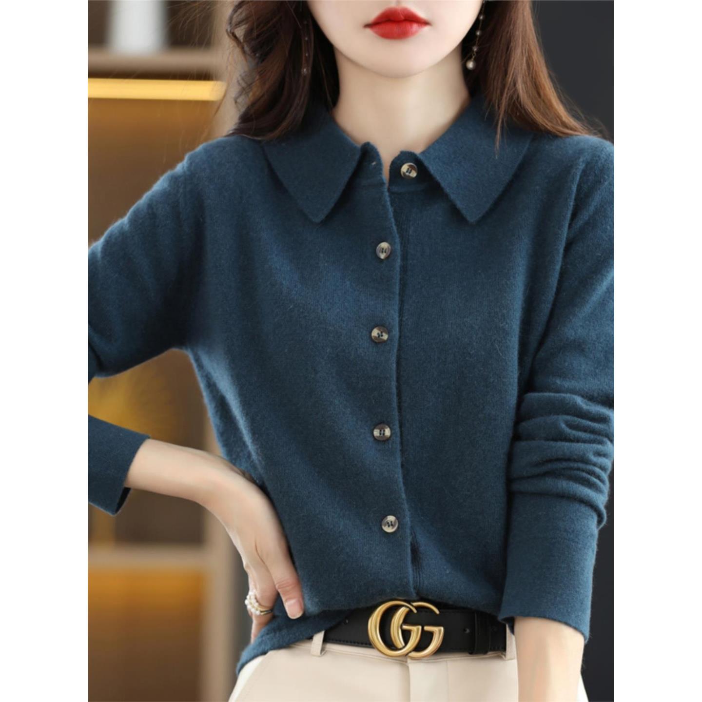 2025冬季羊绒衫女开衫衬衣领精致POLO领长袖毛衣羊毛打底针织衫