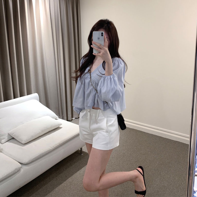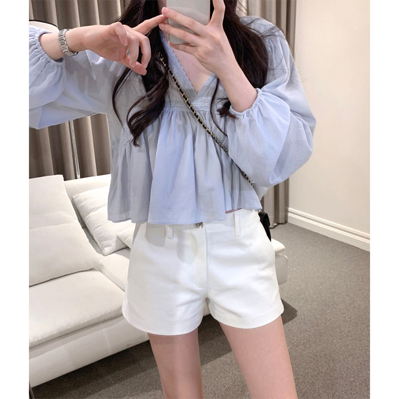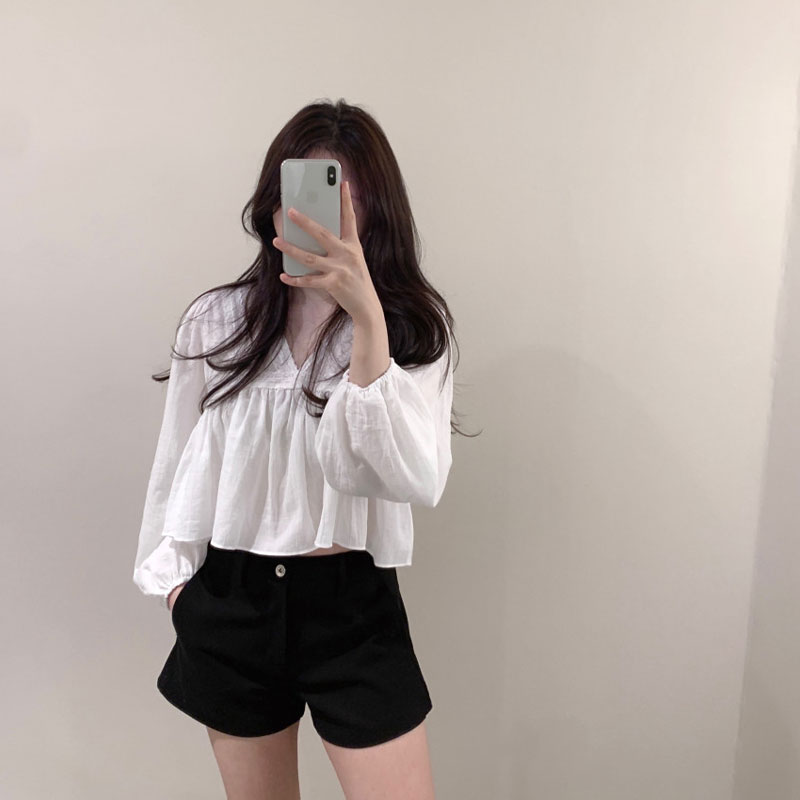 长袖V领泡泡袖短款蕾丝边衬衫女