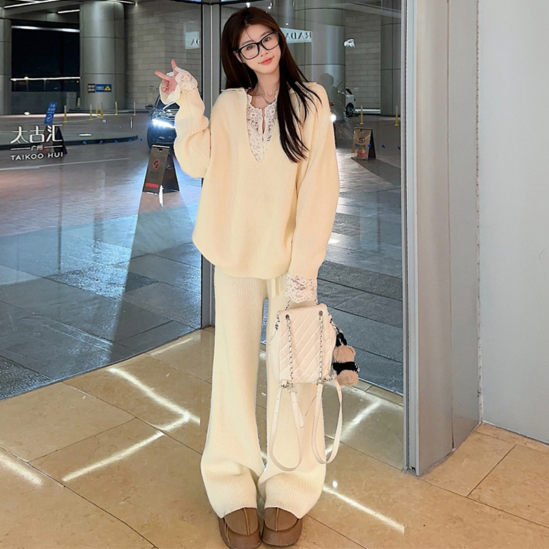 孕妇套装秋冬新款时尚洋气蕾丝打底衫宽松针织上衣阔腿裤2025韩版