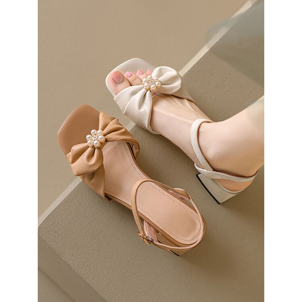 巨好看~凉鞋女夏季中跟粗跟真皮蝴蝶结米白色甜美杏色时尚一字带