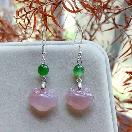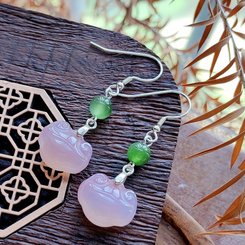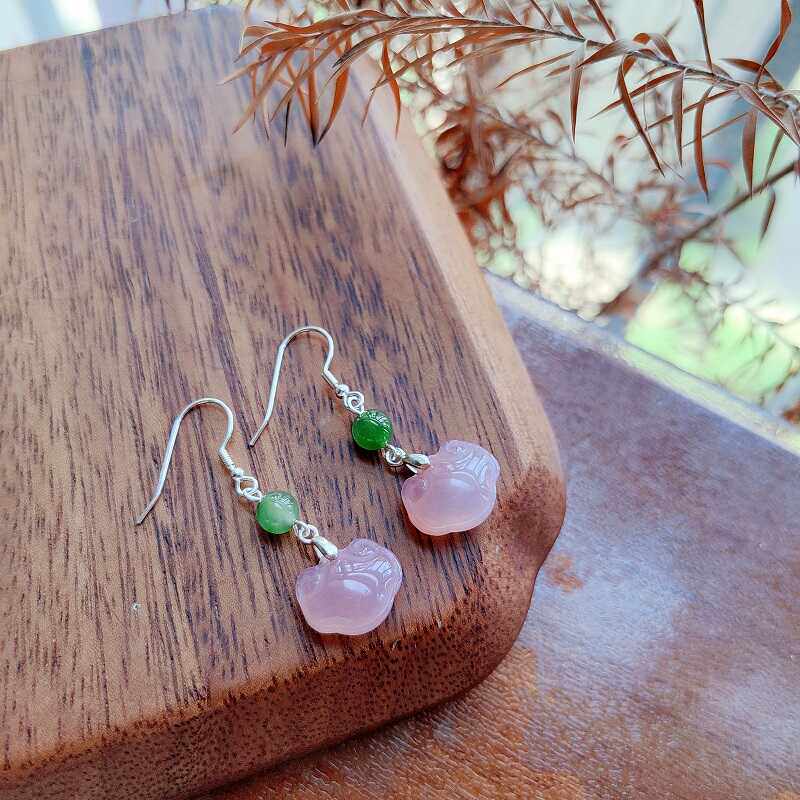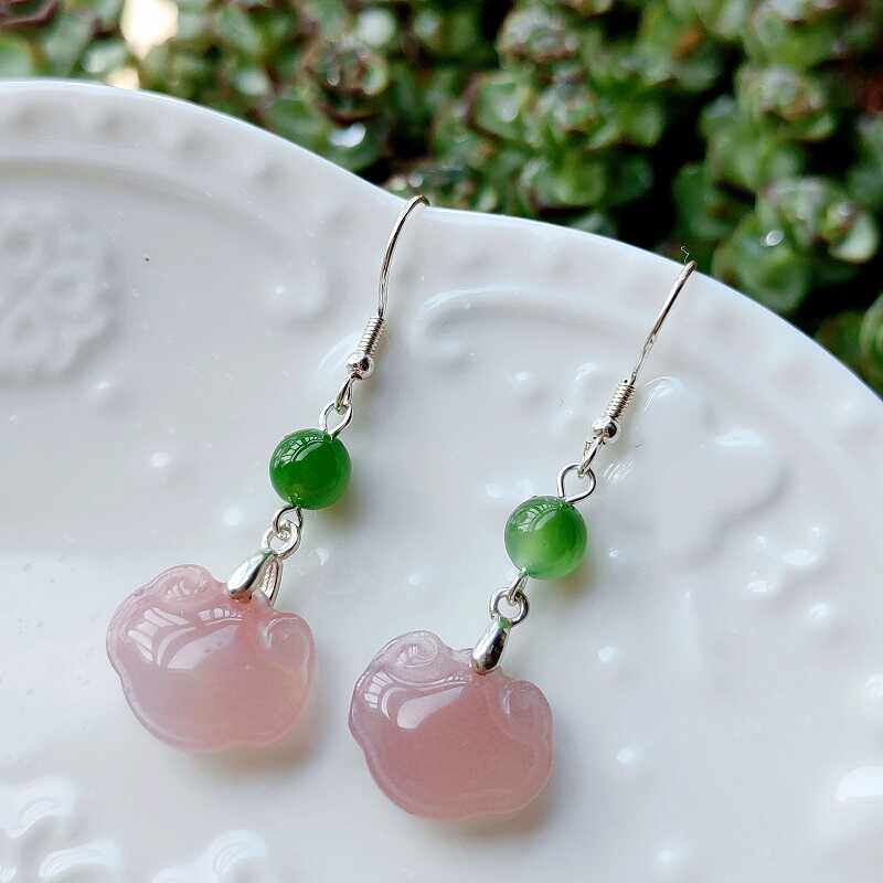 天然粉盐源玛瑙耳环和田碧玉耳饰新中式复古温婉气质长款纯银耳环