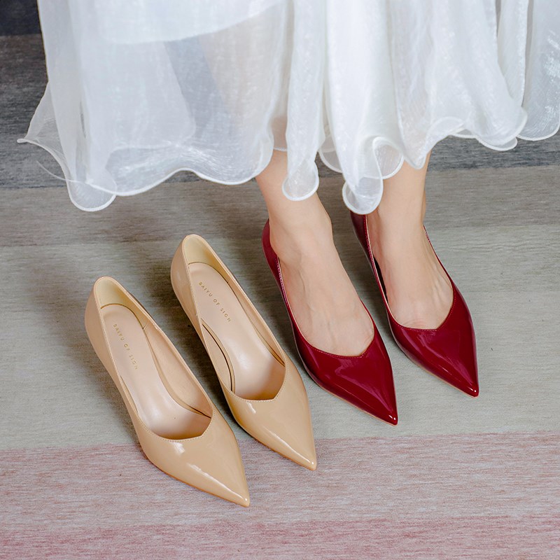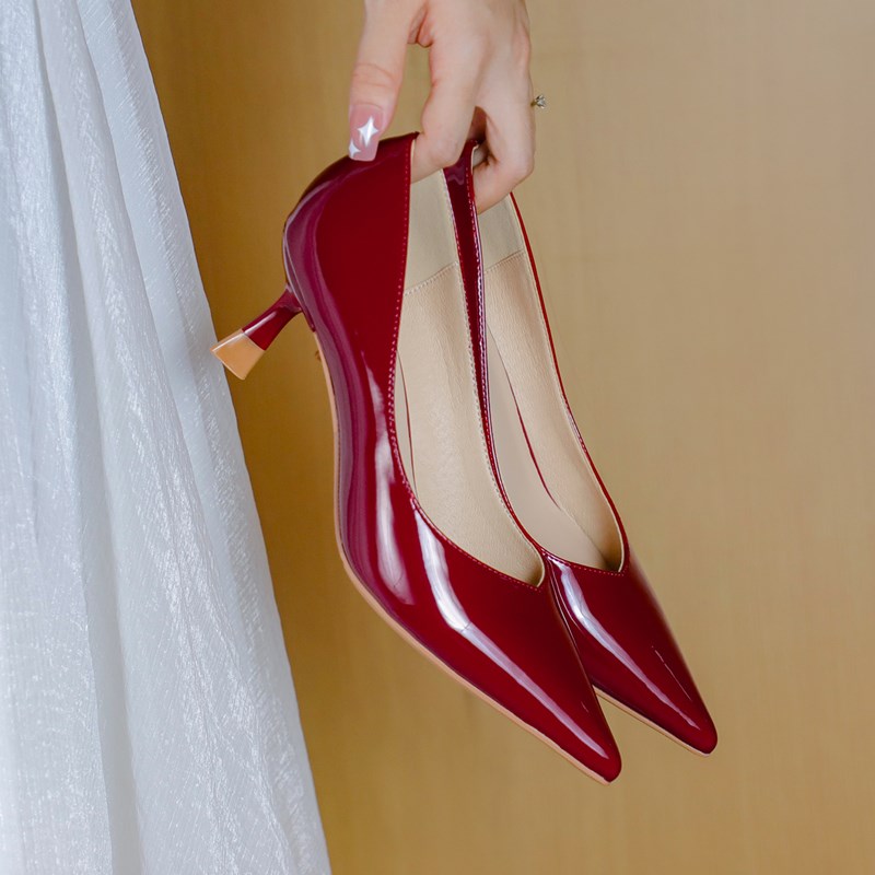 现货速发春季单鞋2024新款性感尖头优雅气质酒红色漆皮高级感高跟