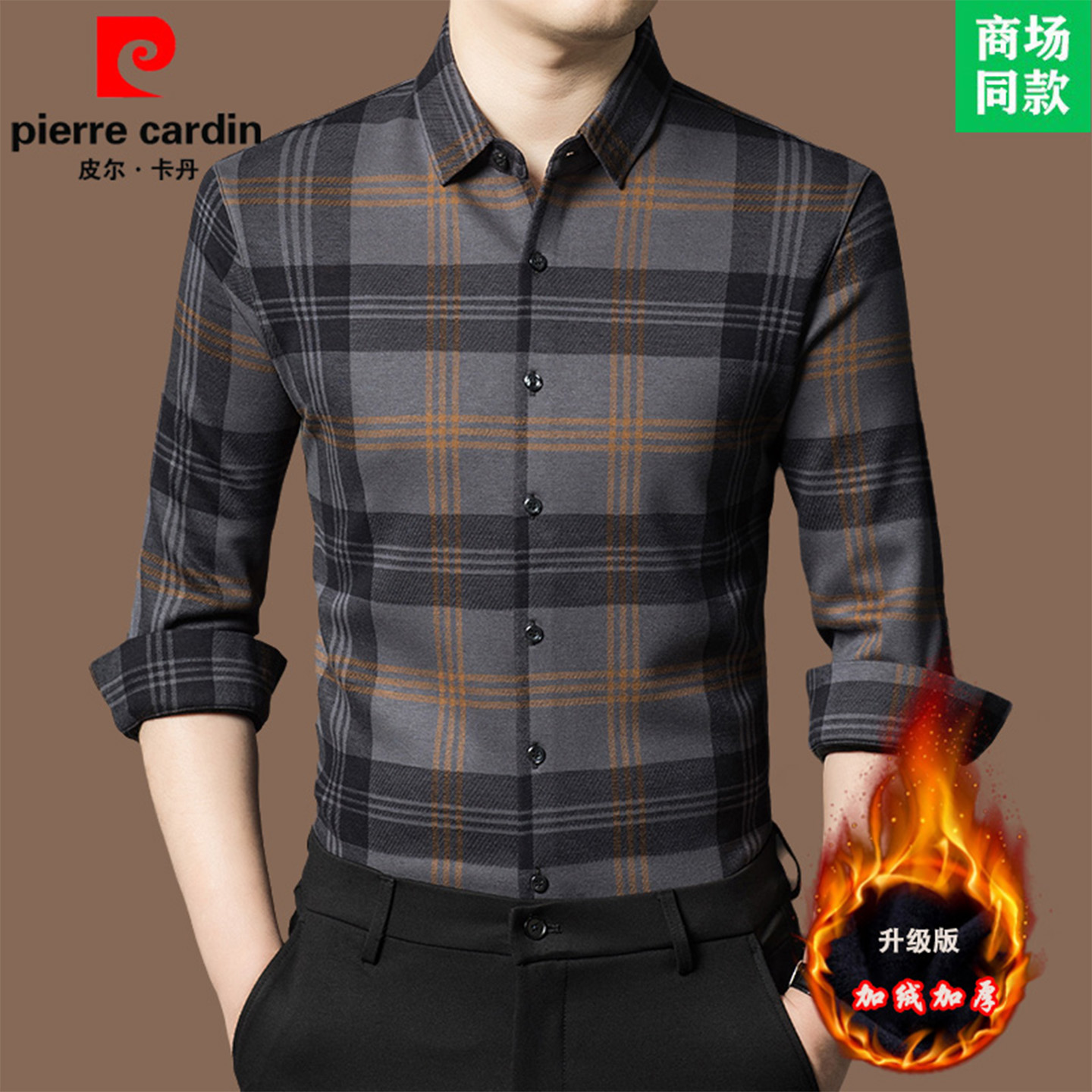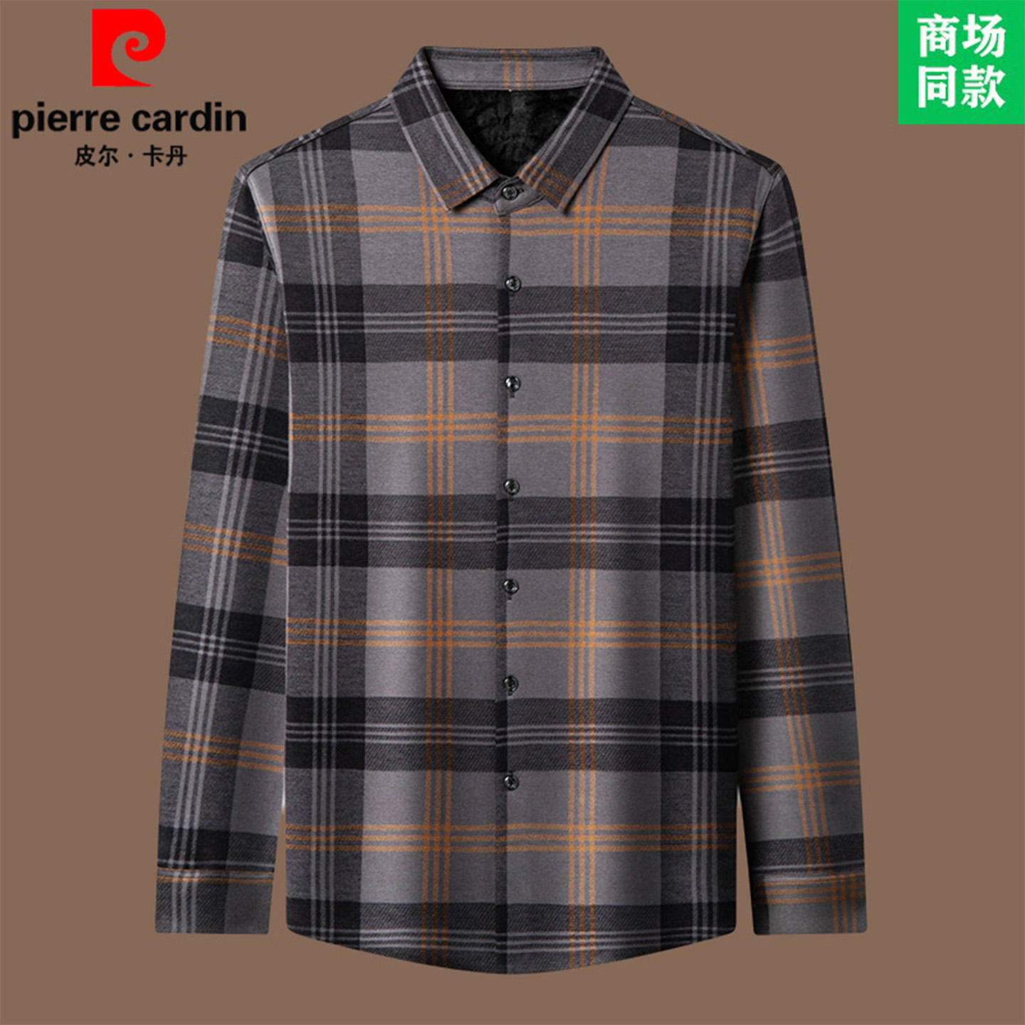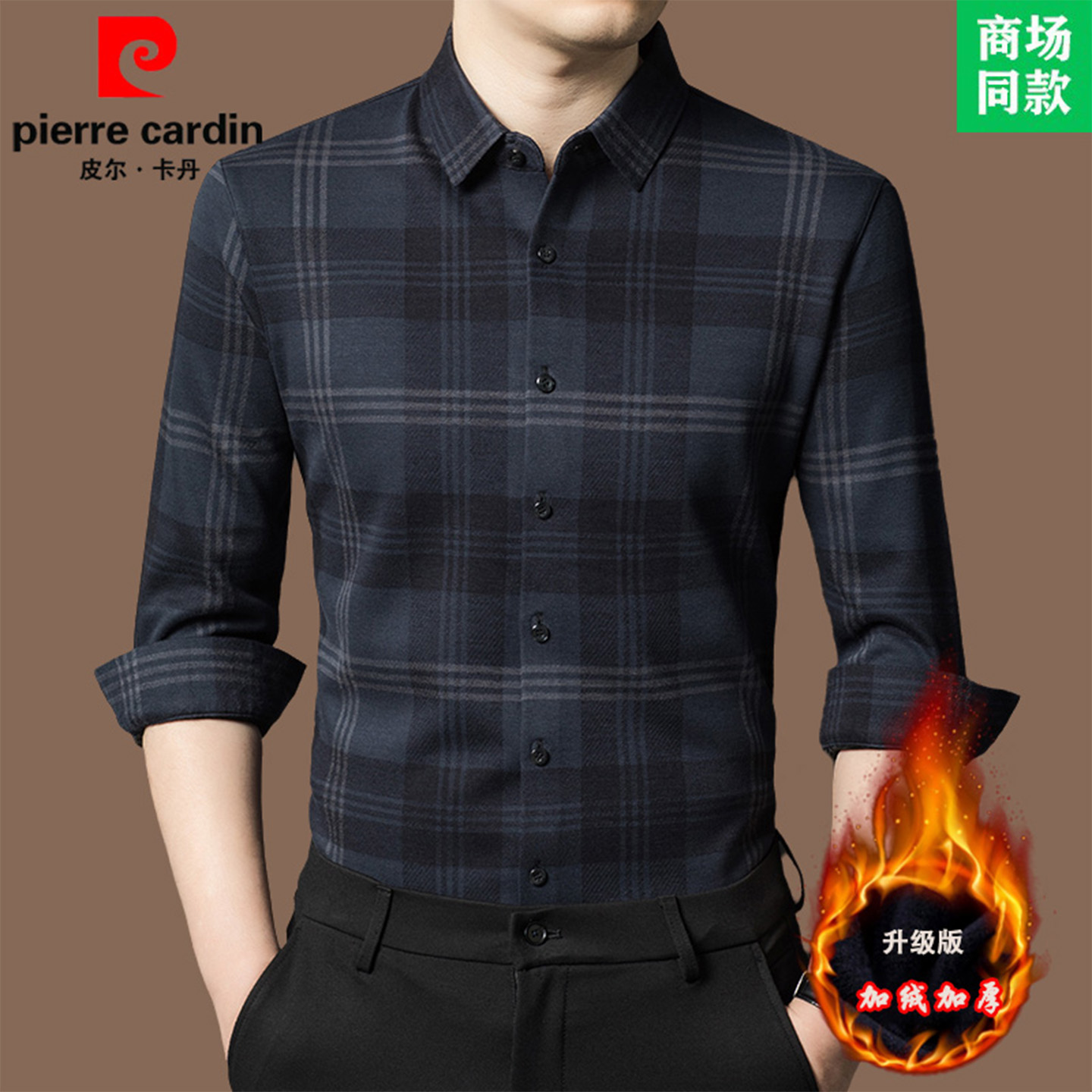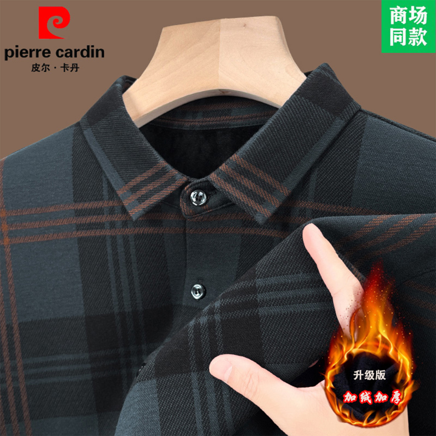 皮尔卡丹正品羊毛衫衬衫高端大牌商务长袖格子衬衣加绒加厚打底衫
