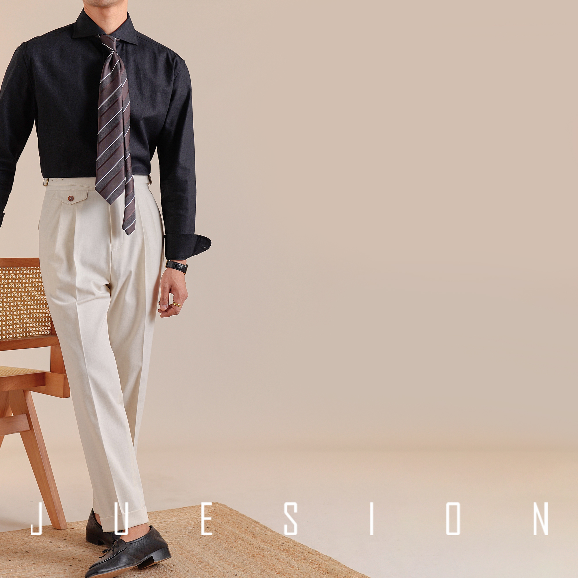 JUESION 春夏季透气一字领衬衫男长袖纯色意式休闲棉麻温莎领衬衣