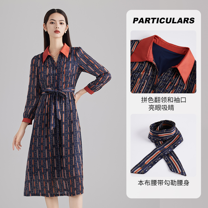 【唯】秋冬新款蓝色印花排扣翻领衬衫裙系带连衣裙收腰时尚长裙