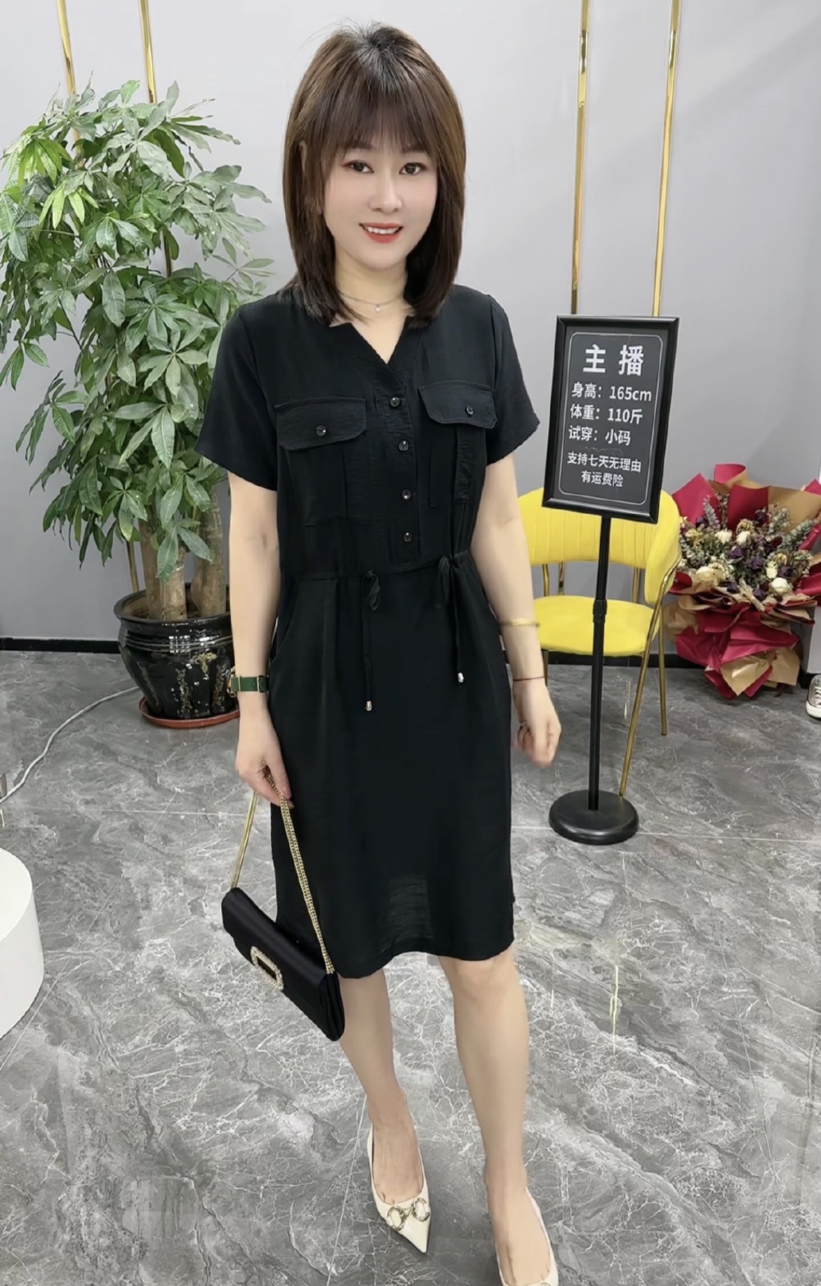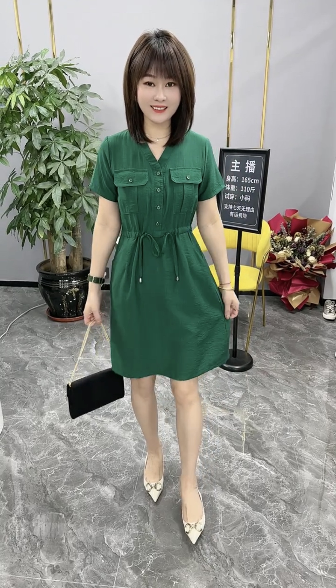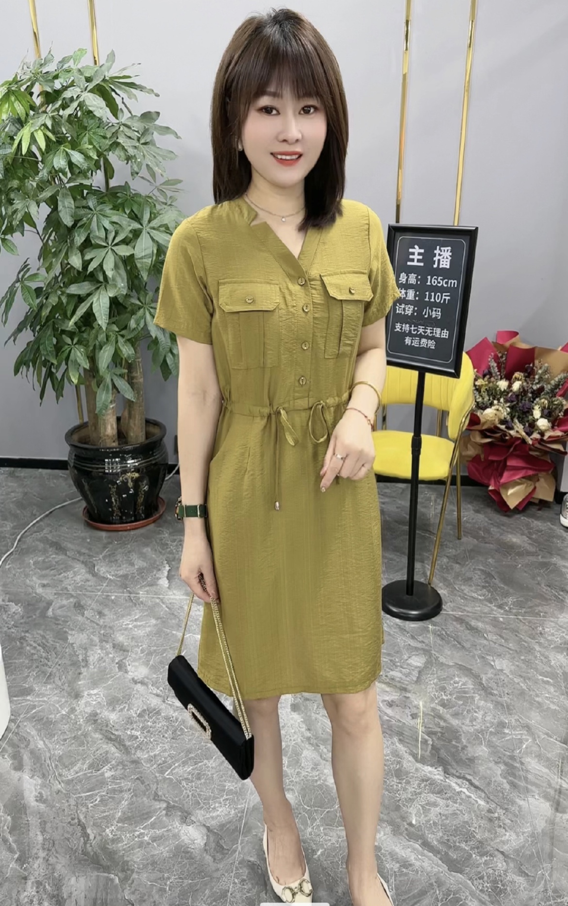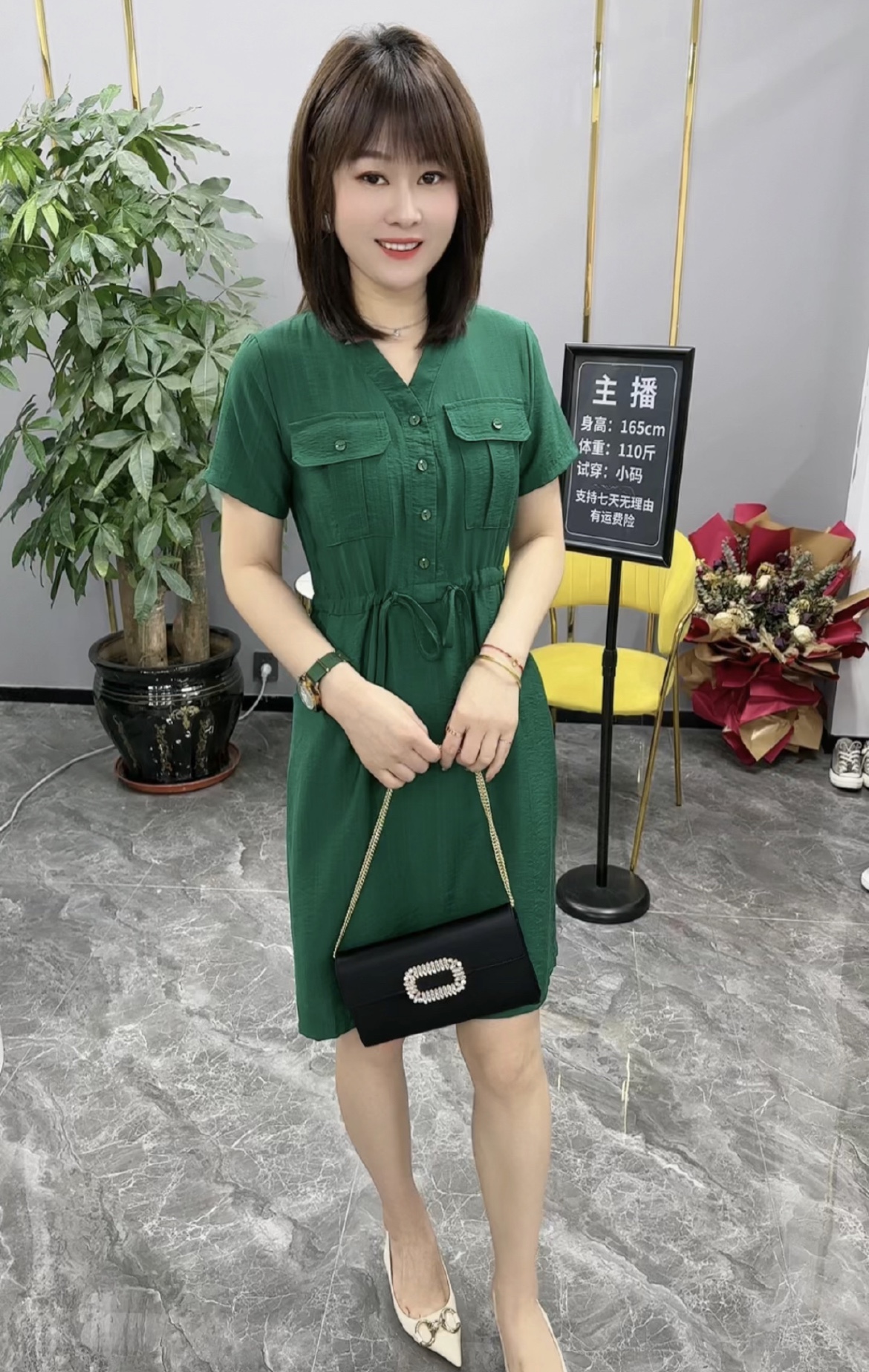 棉麻收腰显瘦短袖兜盖版时尚连衣裙V领单排纽扣夏季冰凉透气女装