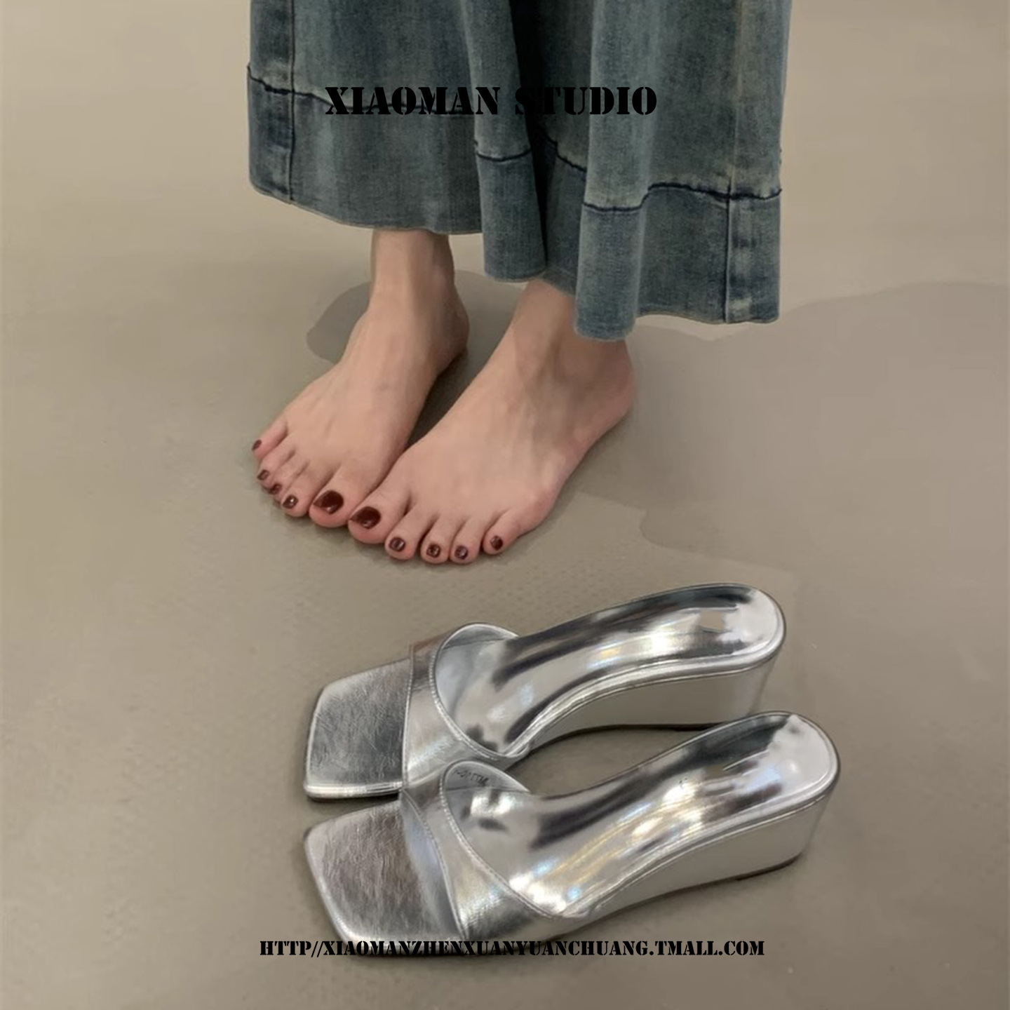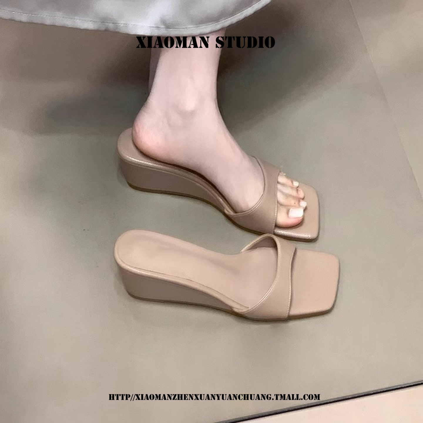 一字带坡跟露趾凉拖鞋女外穿夏季2025新款百搭温柔气质方头一字拖