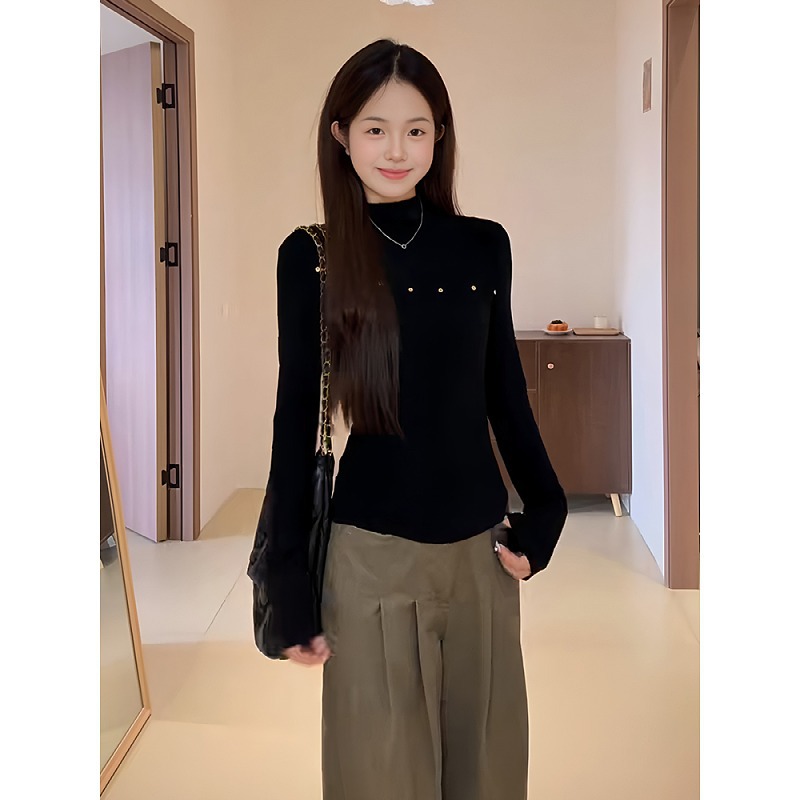 大码女装半高领长袖t恤女秋冬微胖mm设计感修身气质打底衫上衣潮