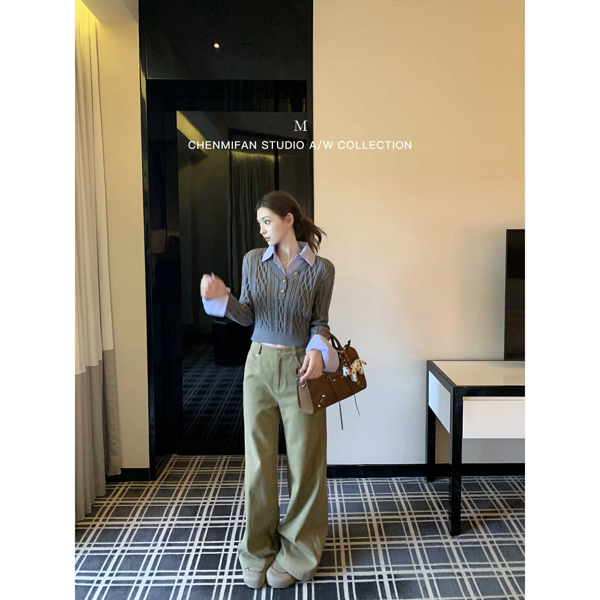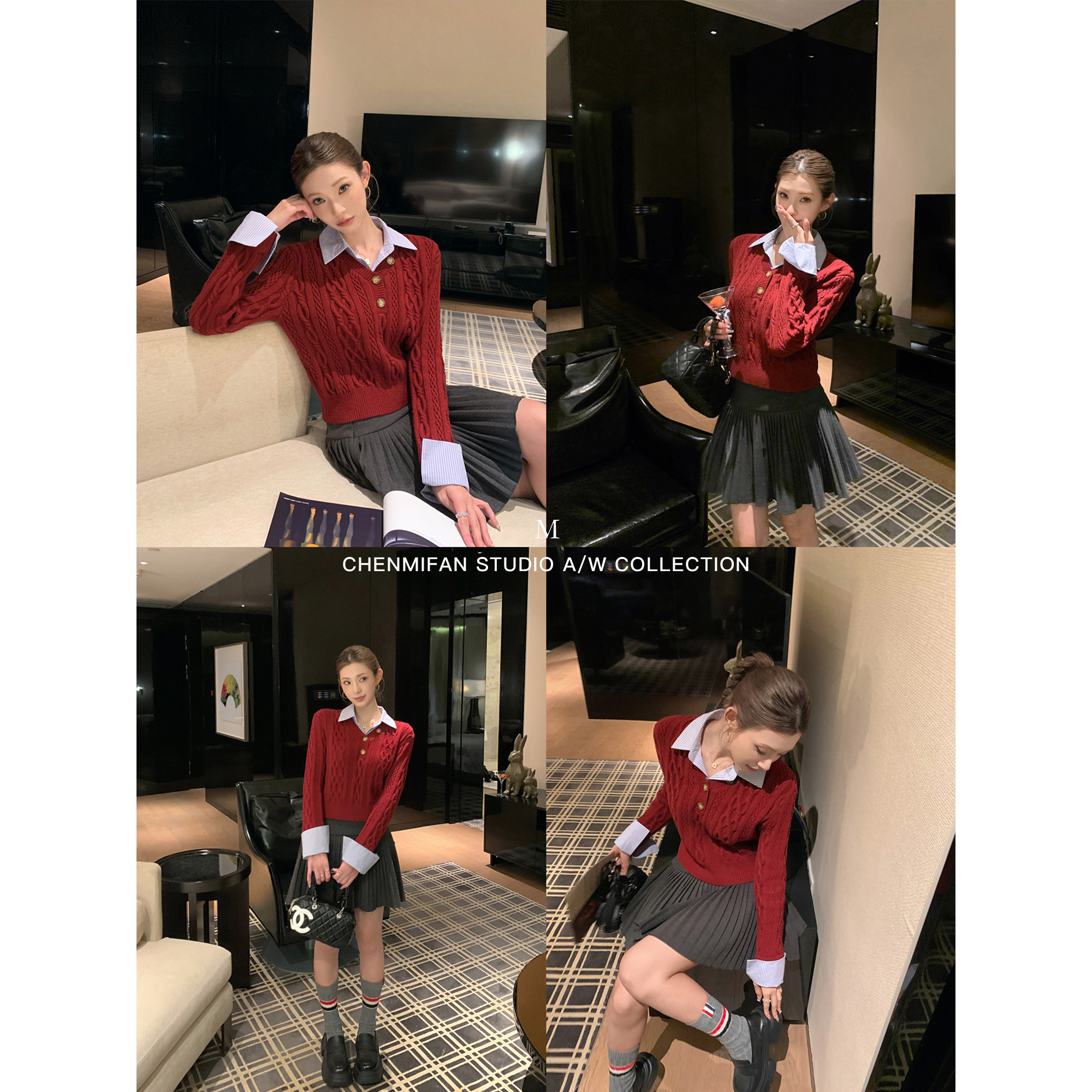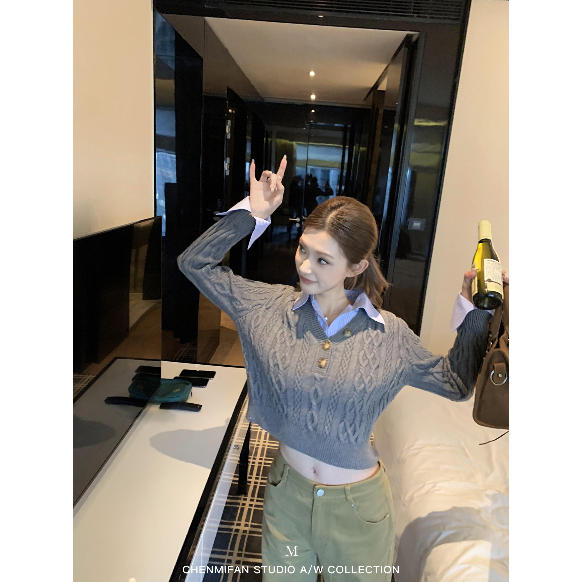 辰米范 学院假日 复古假两件polo领毛衣女修身短款内搭打底针织衫